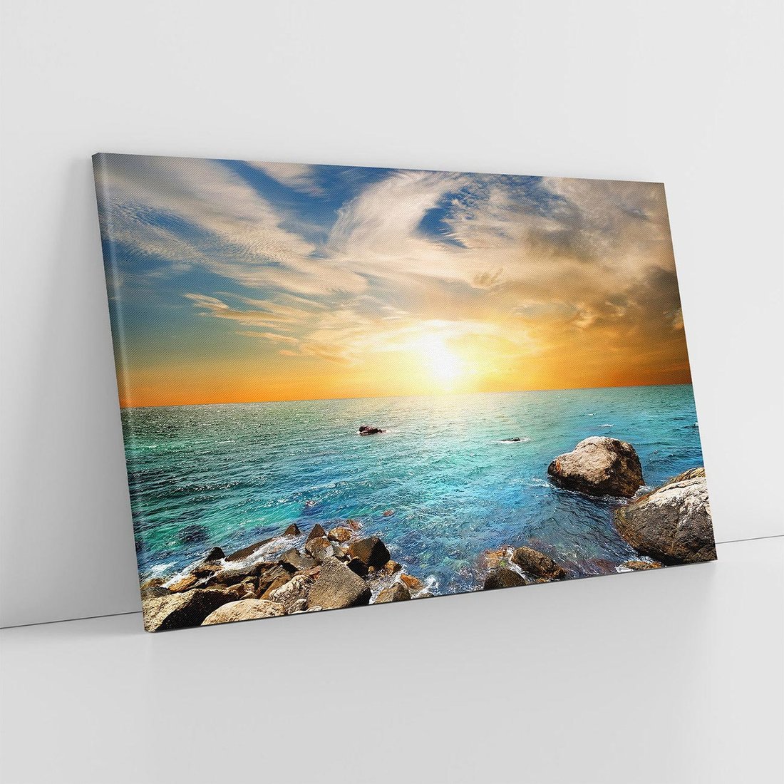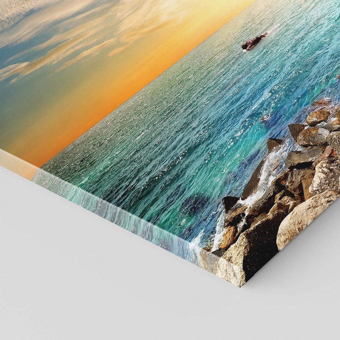 Ten malowniczy obraz na płótnie przeniesie Cię na romantyczny zachód słońca na plaży. Jego ciepłe kolory, złote promienie i spokojna atmosfera dodadzą uroku i relaksu do Twojego wnętrza. Odczuj magię chwili i piękno natury w swoim domu.