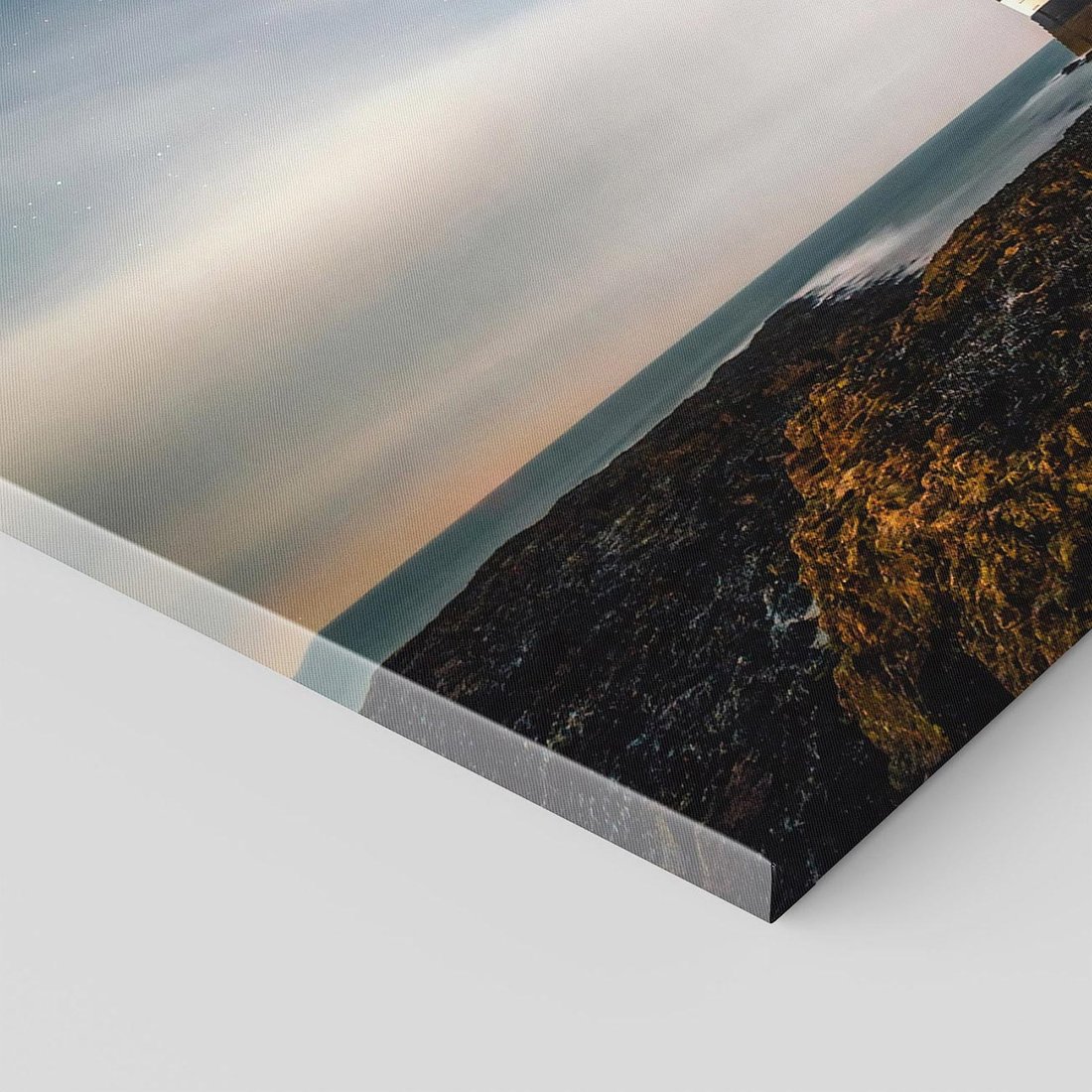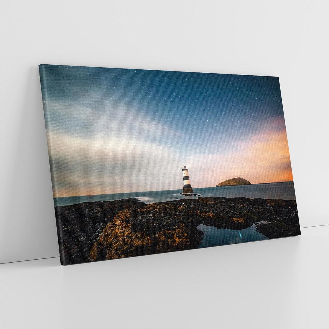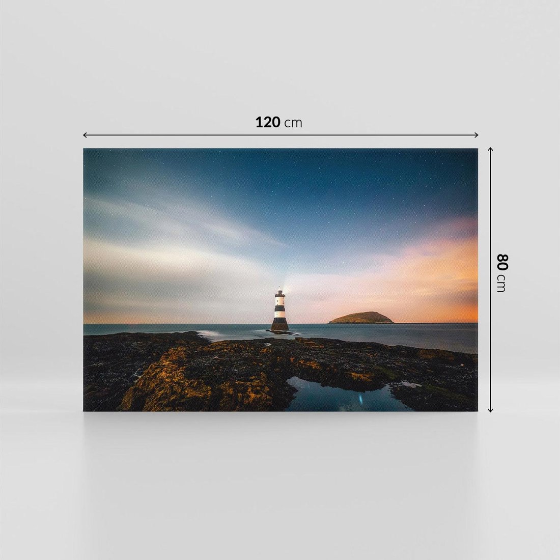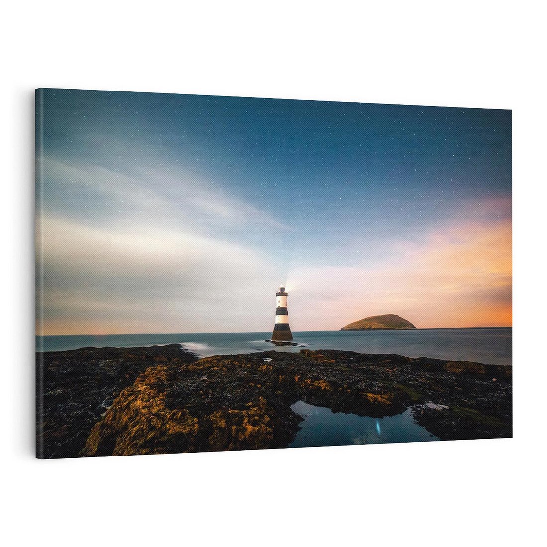 Obraz na płótnie 120x80 - Zachód słońca nad morzem: Magia plażowej scenerii - latarnia morska, morze
