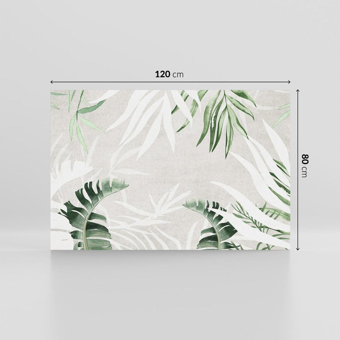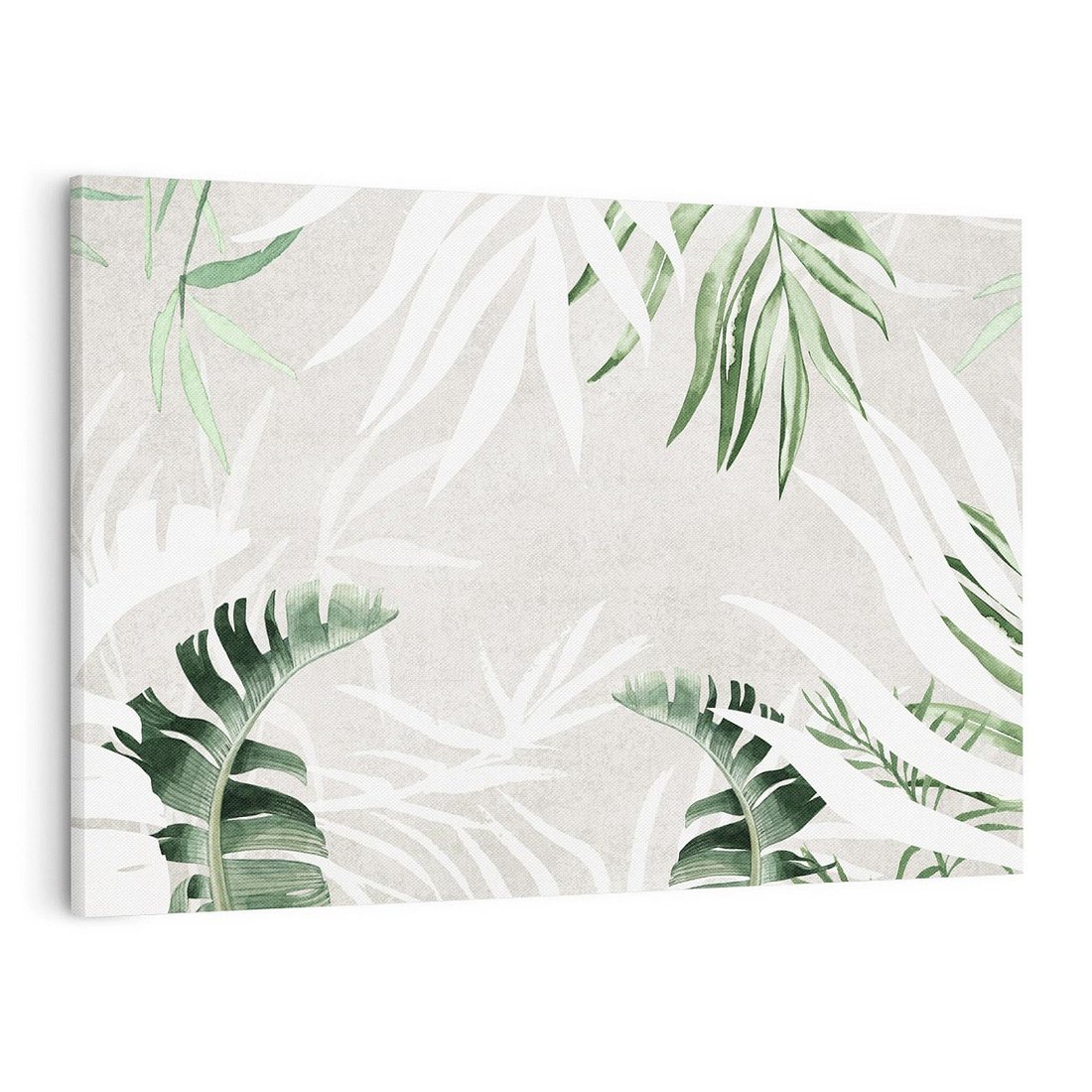 Ten obraz ukazuje tropikalne liście monstery i palm, otulone w bogactwo zieleni i neutralnych barw. Kompozycja emanuje egzotycznym urokiem, przyciągając wzrok swoją roślinną pięknością. To wyjątkowe dzieło sztuki wprowadzi do przestrzeni świeżość natury i spokojną harmonię, idealne dla miłośników tropikalnych akcentów i minimalistycznego designu.