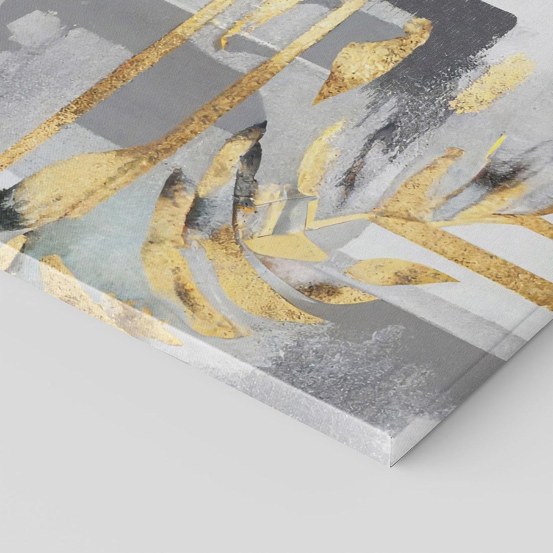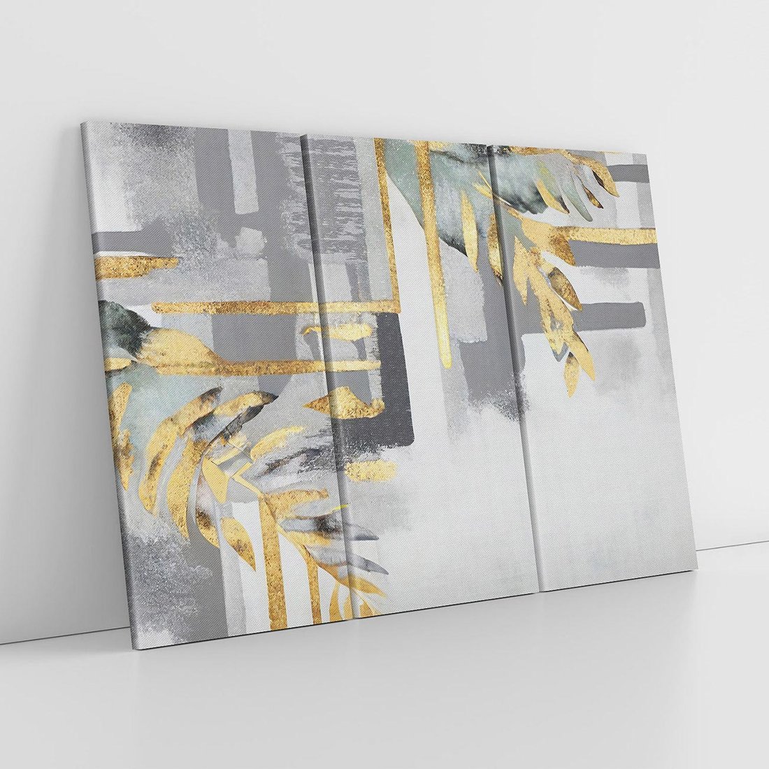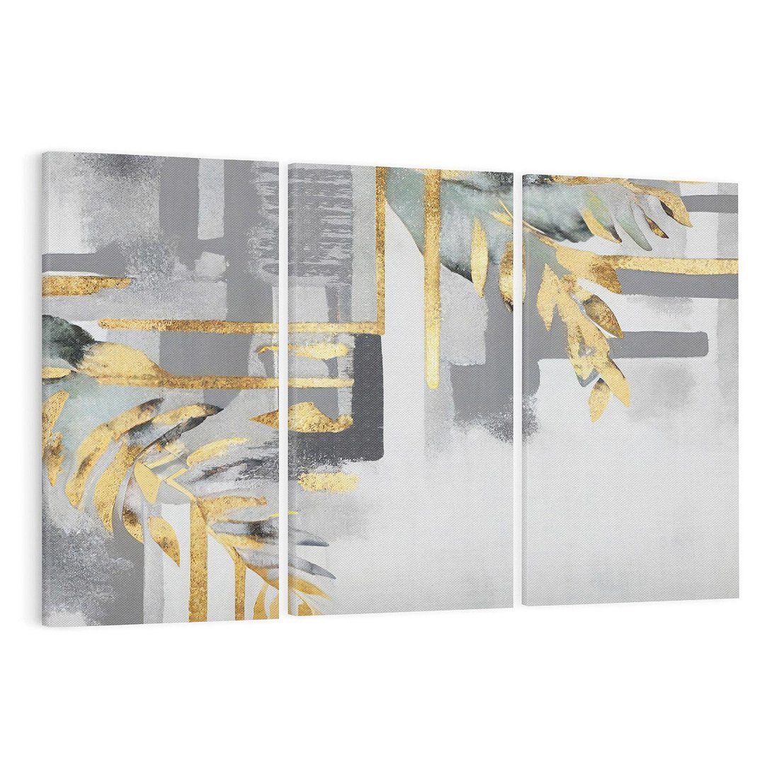 Nowoczesne dzieło sztuki w stylu modern prezentuje złote palmy na szarym tle z geometrycznymi złotymi liniami. Kompozycja łączy klasykę z nowoczesnością, idealnie pasując do loftowych przestrzeni. Wyjątkowe połączenie złota, szarości i geometrii tworzy unikalny akcent, który doda elegancji i świeżości do Twojego wnętrza.