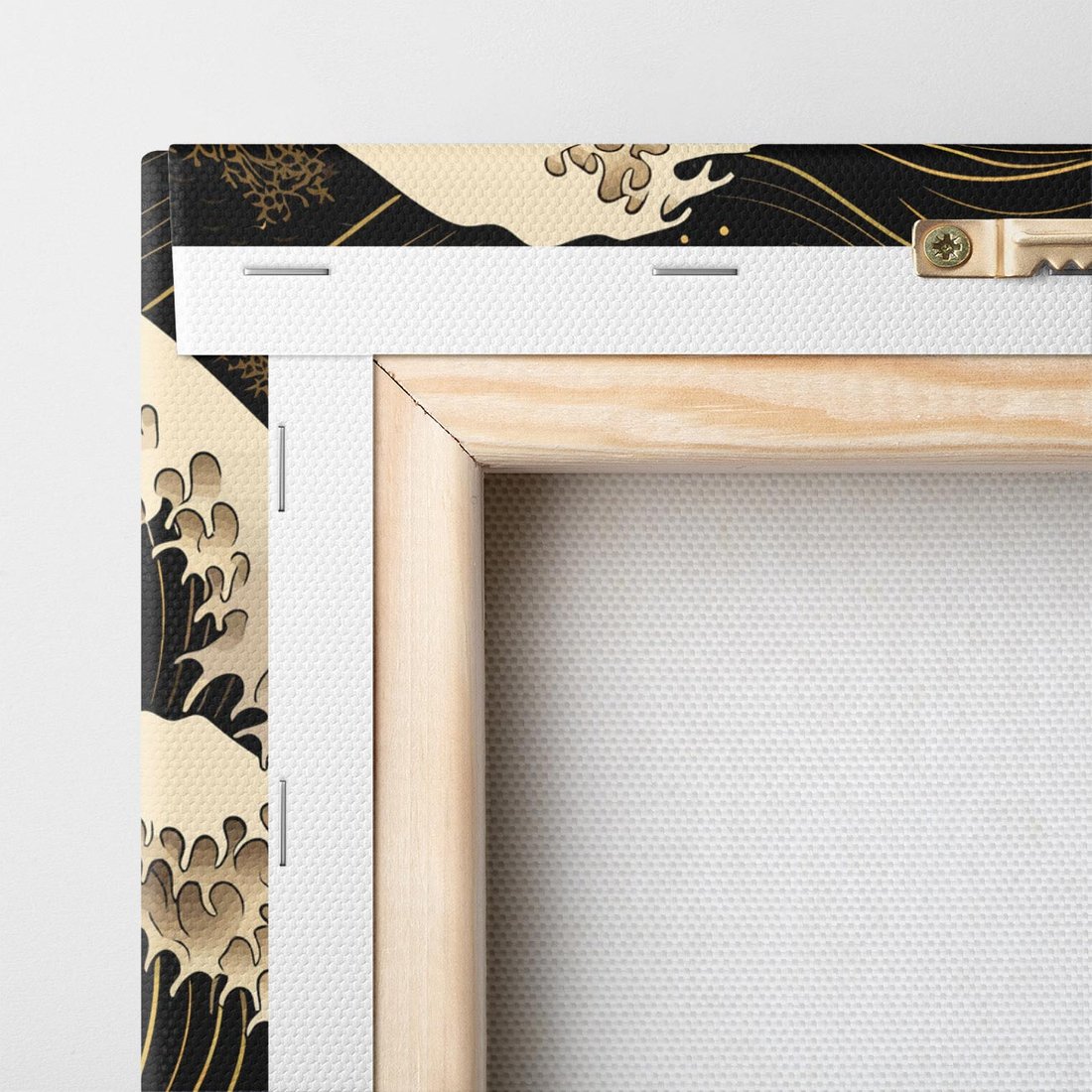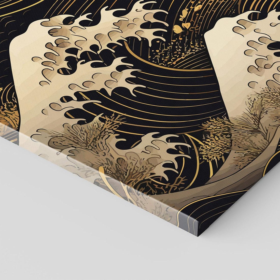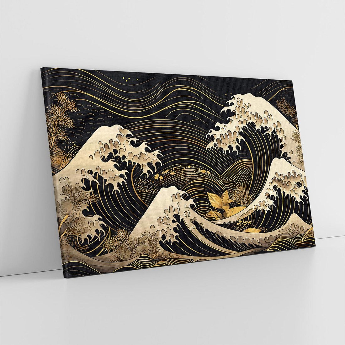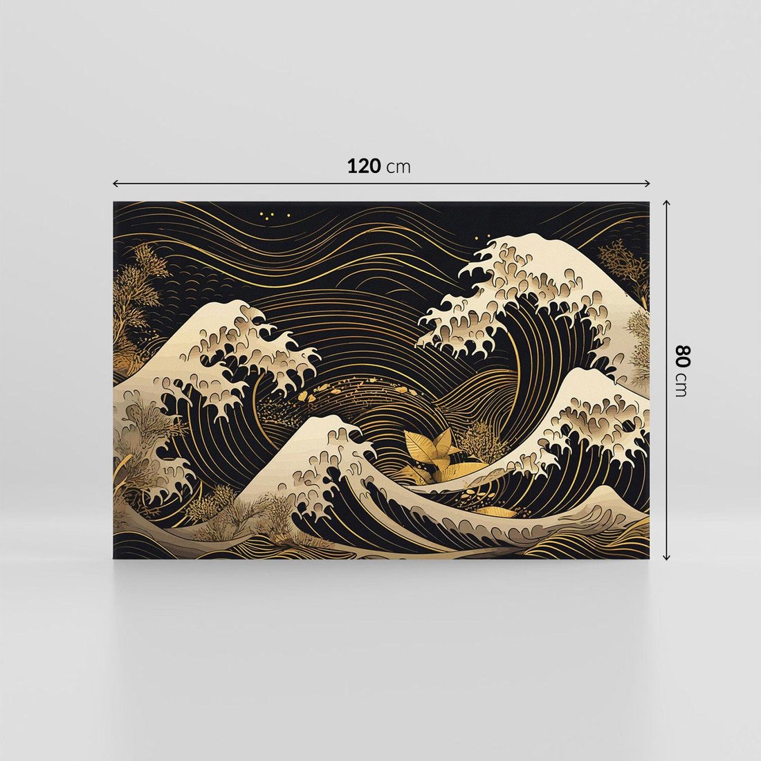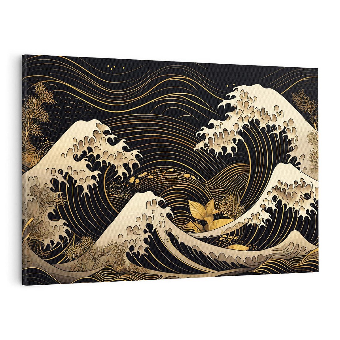 To ciemne malowidło na płótnie przenosi Cię do Japonii, ukazując fale morskie w graficznym stylu. Złote akcenty tworzą magiczny efekt, który ożywi Twoje wnętrze.