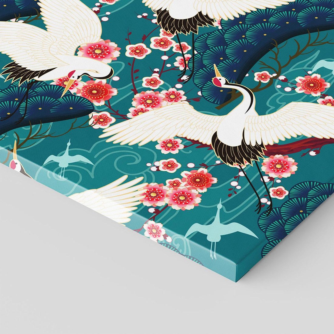 Grafika przedstawia orientalne japońskie żurawie lecące na turkusowym tle, w otoczeniu delikatnych kwiatów wiśni. Kształty wachlarzy dodają kompozycji elegancji. To artystyczne dzieło niesie ze sobą odrobinę dalekich kultur, przynosząc spokój i subtelny urok do wnętrza. Doskonałe do dekoracji w każdej przestrzeni.