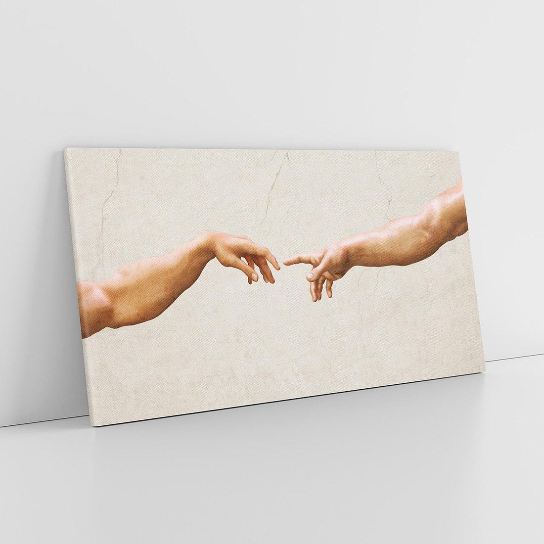 Ten wyjątkowy obraz stanowi hołd dla sztuki antyku i Michała Anioła. Ukazuje chwile Stworzenia Adama, gdzie ręka Boga dotyka ludzkiej dłoni. Wyrazista kompozycja i mistyczna atmosfera przyciągają wzrok i inspirują do refleksji nad siłą ducha i piękna boskiej twórczości.