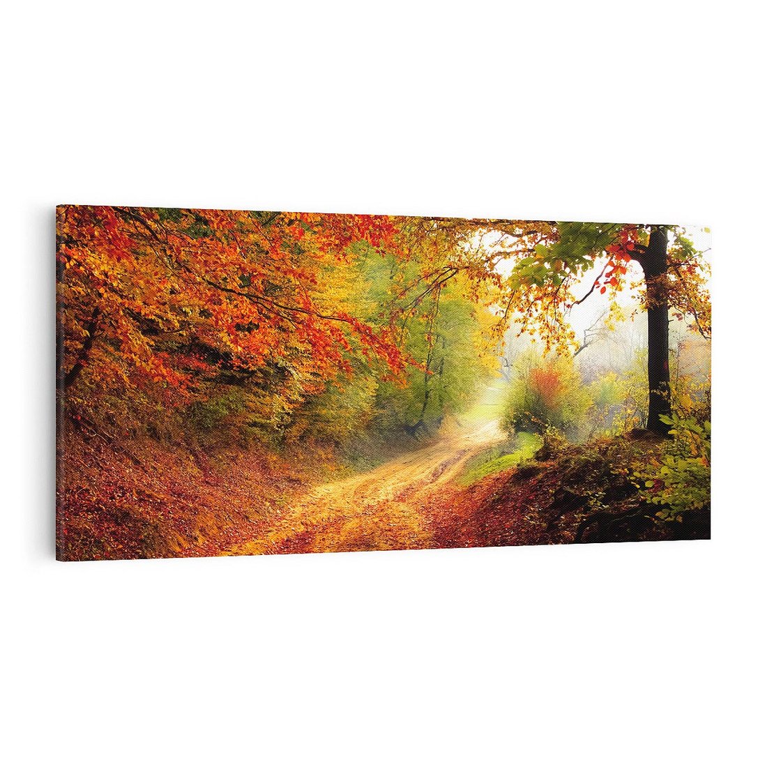 Odkryj urok jesieni i naturalnego piękna lasu dzięki temu obrazowi na płótnie. Pejzaż przedstawiający malowniczą drogę prowadzącą przez las w złocistych odcieniach jesieni tworzy atmosferę spokoju i ukojenia.