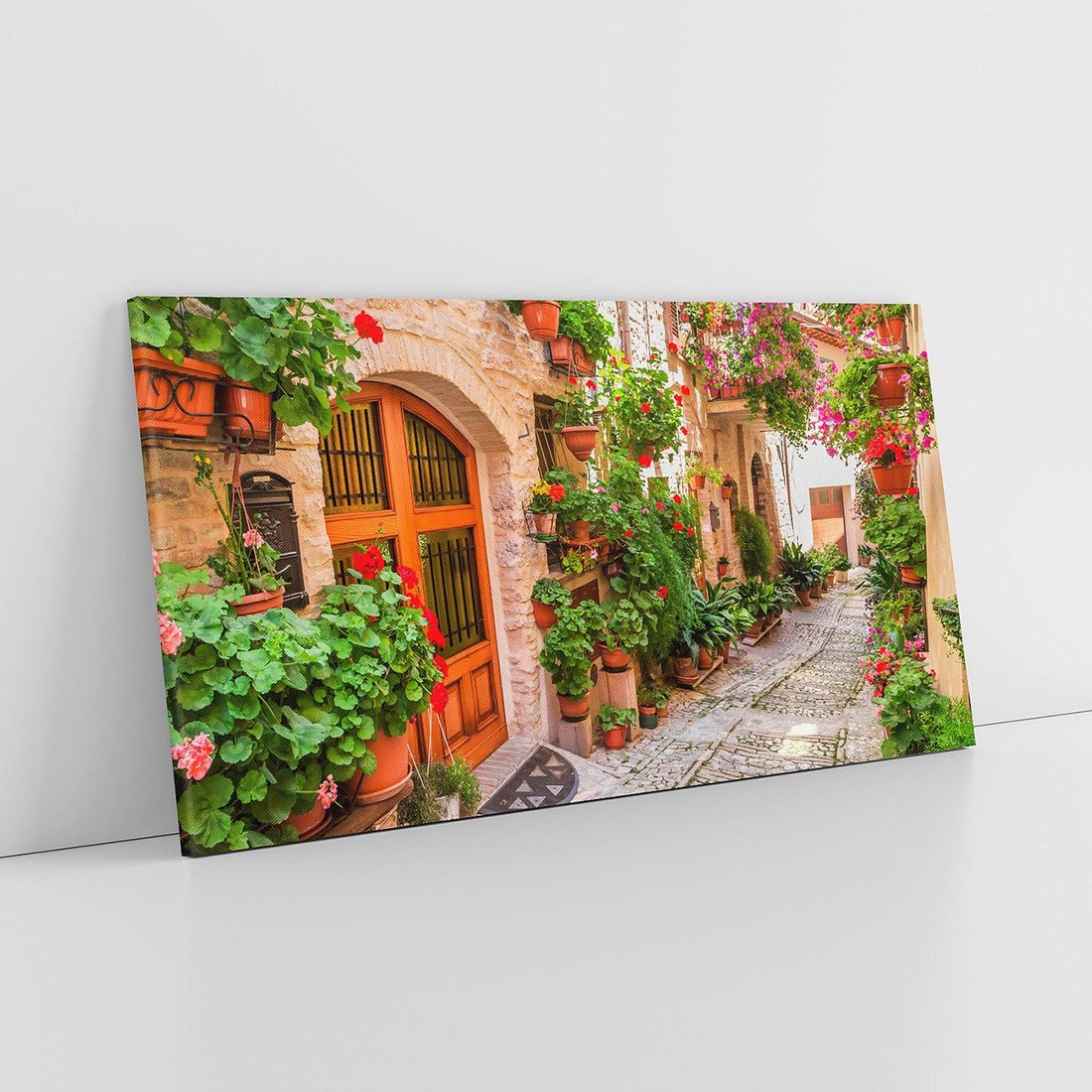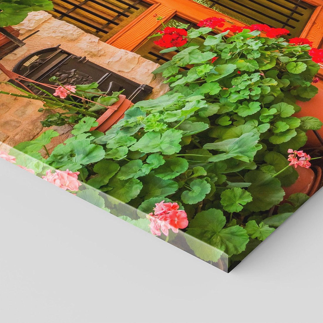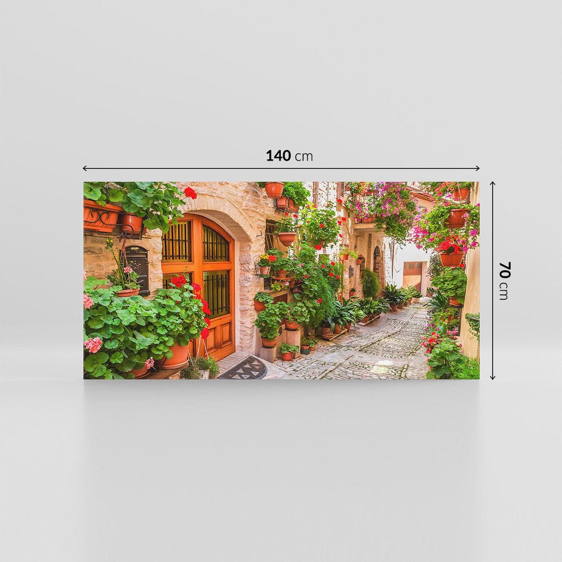 Przenieś się w świat kolorowej harmonii dzięki temu malowniczemu obrazowi przedstawiającemu uliczkę miasta wśród kwiatów. Kolorowe fasady, kwitnące rośliny i miejski krajobraz tworzą radosną kompozycję. Ten obraz dodaje ożywienia i radości, idealny dla osób pragnących cieszyć się kolorami i urokami miejskiego życia w towarzystwie pięknych kwiatów.