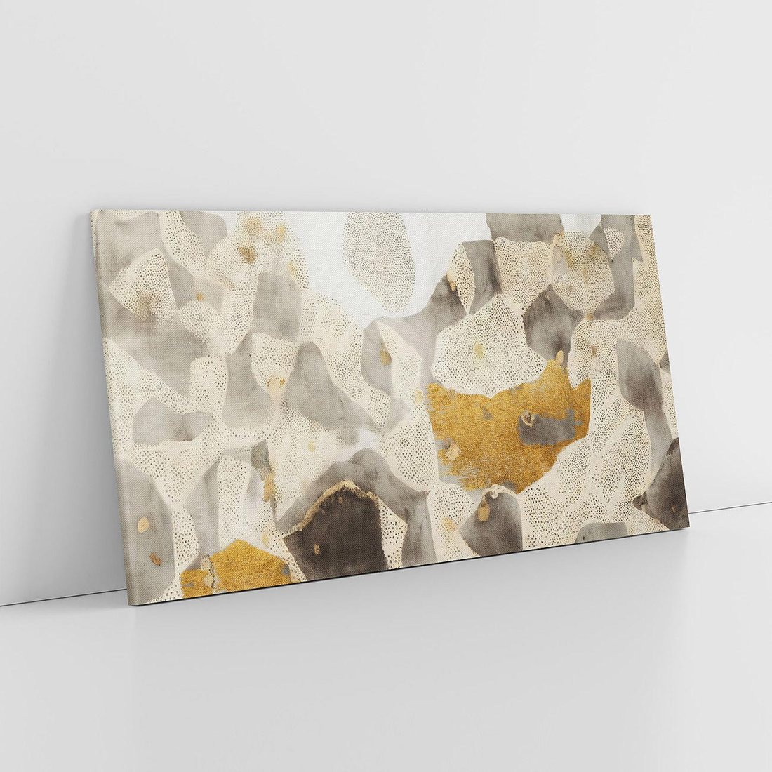 Ten nowoczesny obraz o charakterze glamour przedstawia złote i beżowe plamy, tworząc abstrakcyjne formy. Szarość dodaje elegancji i głębi kompozycji. To wyjątkowe dzieło sztuki idealnie pasuje do nowoczesnych wnętrz, nadając im subtelny luksus i artystyczną atmosferę.