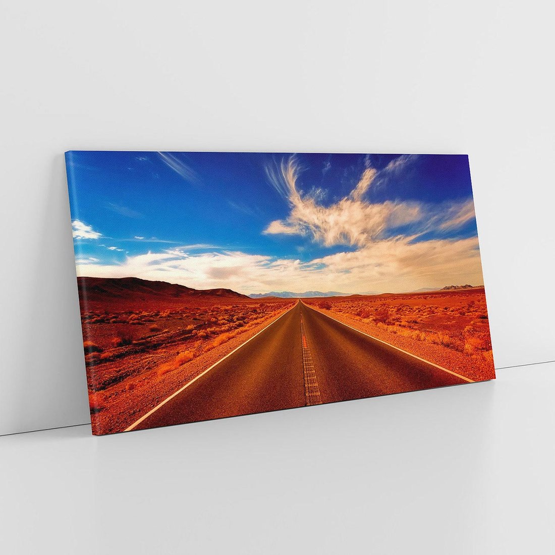 Obraz na płótnie przedstawiający malowniczą drogę prowadzącą przez pustynię. Ta dynamiczna kompozycja przyniesie do wnętrza energię i pasję podróży.