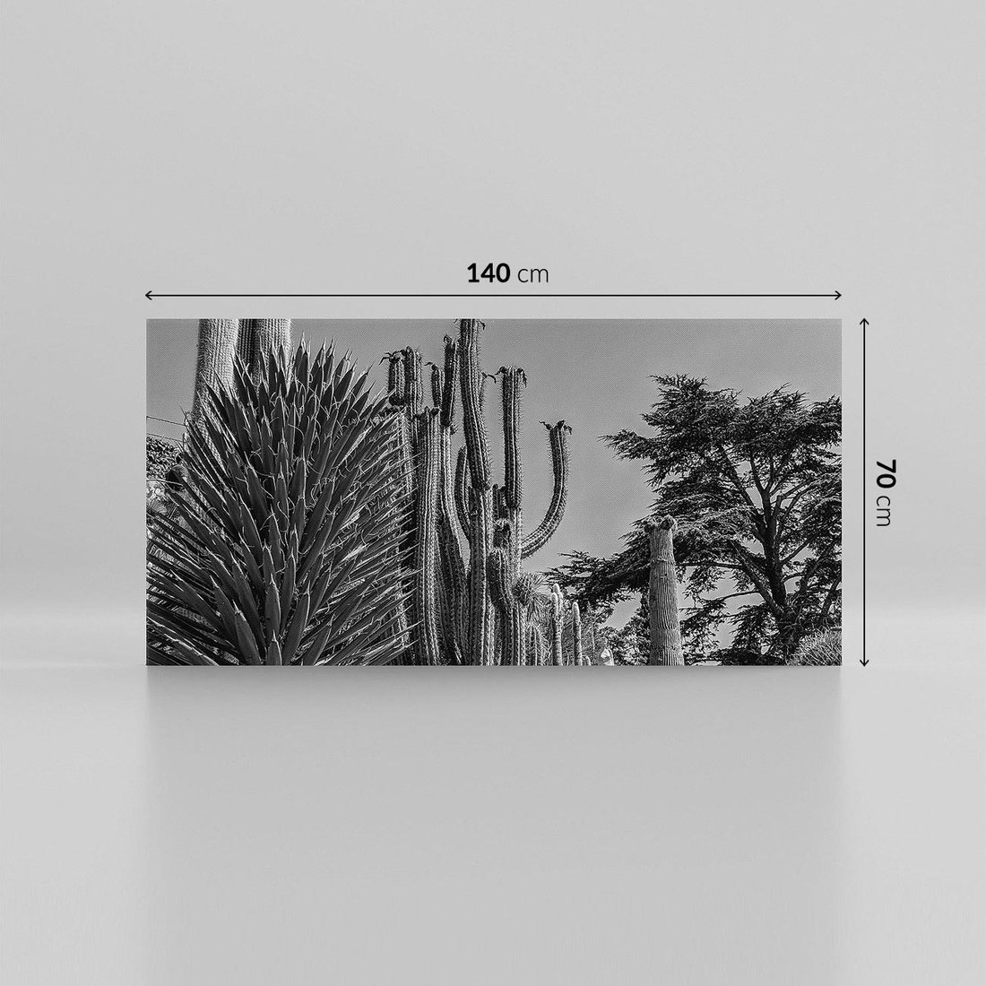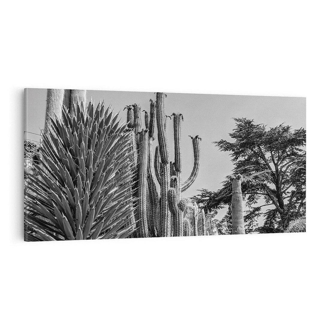 To czarno-białe zdjęcie ukazuje surową piękność pustyni, gdzie wydźwięk kontrastujących odcieni czerni i bieli podkreśla jej dzikość i spokój jednocześnie. Kaktusy, rosnące w tej niegościnnej przestrzeni, dodają kompozycji życia i symbolizują wytrwałość w trudnych warunkach. To zdjęcie emanuje spokojem i samotnością pustyni, co czyni je idealnym dodatkiem do minimalistycznych wnętrz, podkreślając urok prostoty i natury.