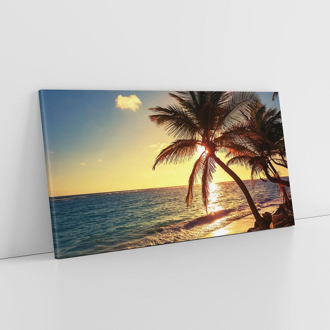 Przenieś się w magiczne chwile zachodu słońca na tropikalnej plaży dzięki temu malowniczemu obrazowi. Ciepłe kolory, palmowe drzewa i błyszczące morze tworzą romantyczną atmosferę. Ta kompozycja dodaje błogości i egzotycznego klimatu, idealna dla osób pragnących przenieść się w magiczne chwile i oddać się pięknu tropikalnej przyrody.