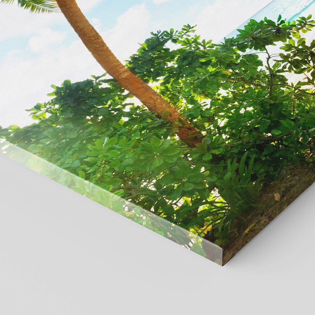 Ten malowniczy obraz ukazuje rajską plażę na Seszelach otoczoną palmami. Jego białe piaski, turkusowe morze i bujna roślinność przeniosą Cię w tropikalny raj. Dodaj nutę egzotyki i spokoju do swojego wnętrza.
