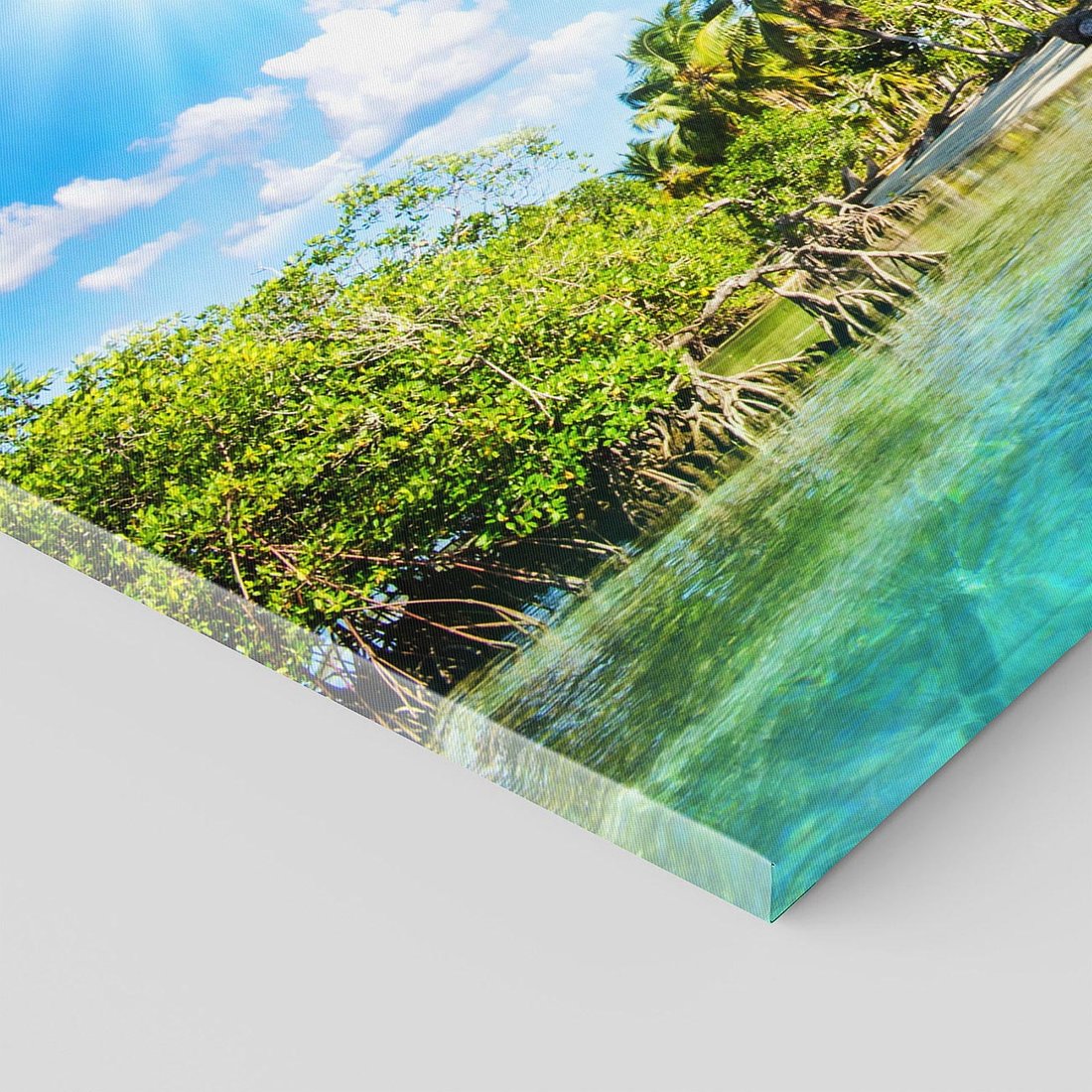 Przenieś się na rajską plażę, gdzie palmy kołyszą się na wietrze, a błękitne fale zapraszają do relaksu i wakacyjnej beztroski. Ta malownicza kompozycja przywołuje atmosferę sielskich chwil spędzonych na egzotycznej plaży.