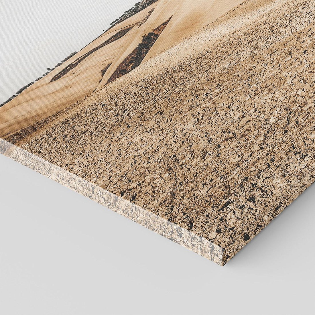 Ta fotografia ukazuje pustynny krajobraz w odcieniach sepii, gdzie wiodąca w głąb ścieżka prowadzi ku horyzontowi. To wędrówka przez niezmierzone przestrzenie, gdzie piasek i niebo zlewają się w harmonii. To zaproszenie do odkrycia tajemniczego piękna i spokoju pustynnej równiny.