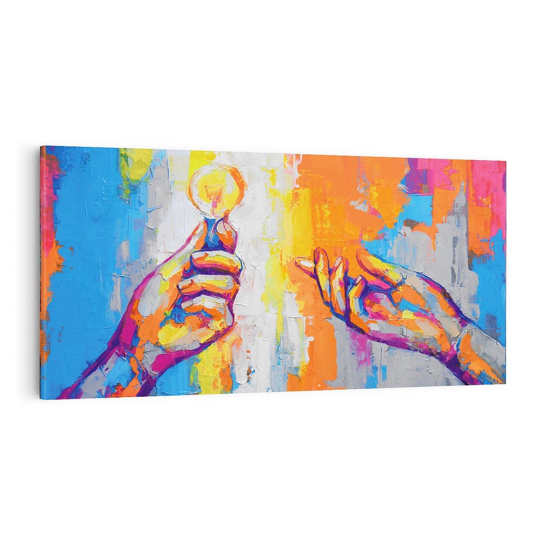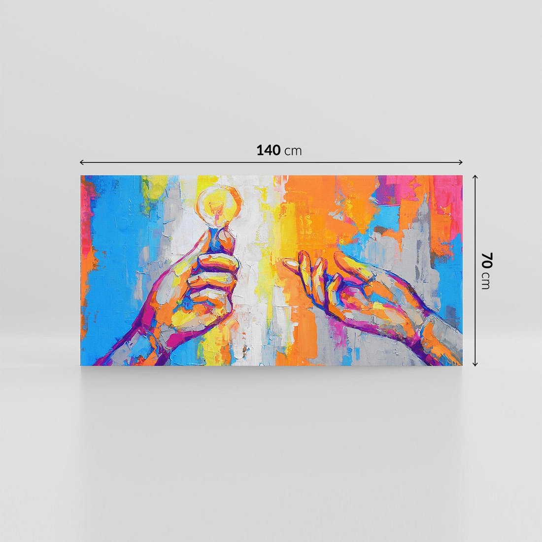 Obraz na płótnie 140x70 - Refrakcje wewnętrznego światła - abstrakcyjne dzieło, dłoń trzyma żarówkę