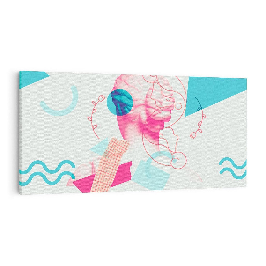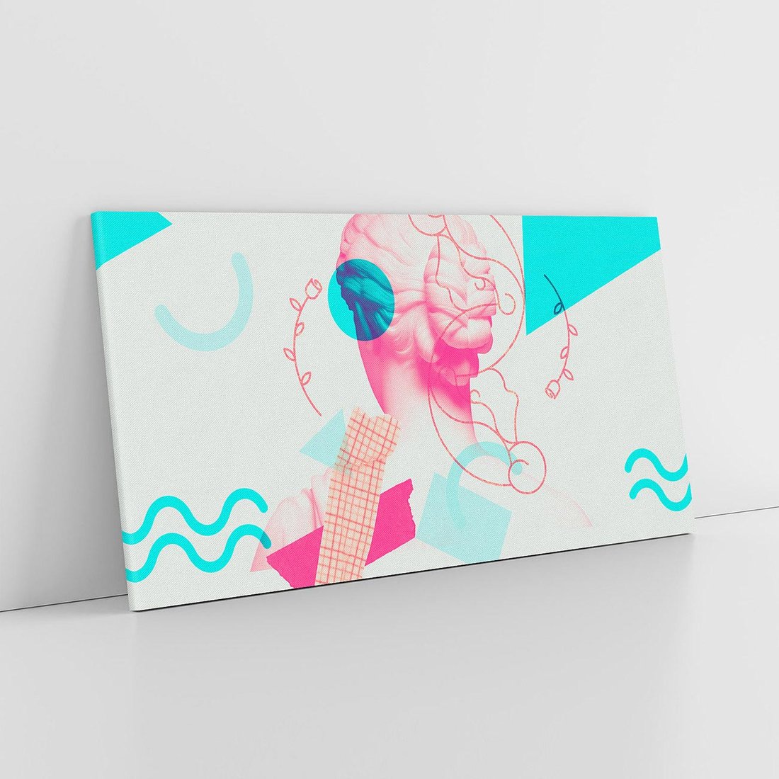 Ten nowoczesny kolaż łączy antyczną rzeźbę kobiety z elementami sztuki współczesnej. W delikatnych odcieniach różowego ukazuje piękno ludzkiej formy, przenosząc je w nowoczesny kontekst. To unikalne dzieło sztuki przyciąga wzrok i inspiruje do refleksji nad pięknem i ewolucją sztuki przez wieki.