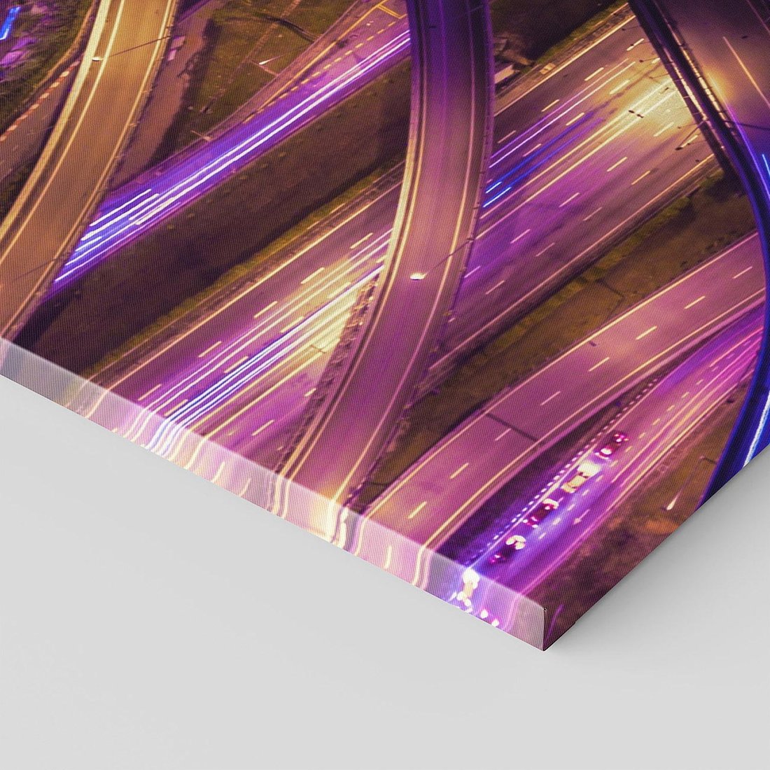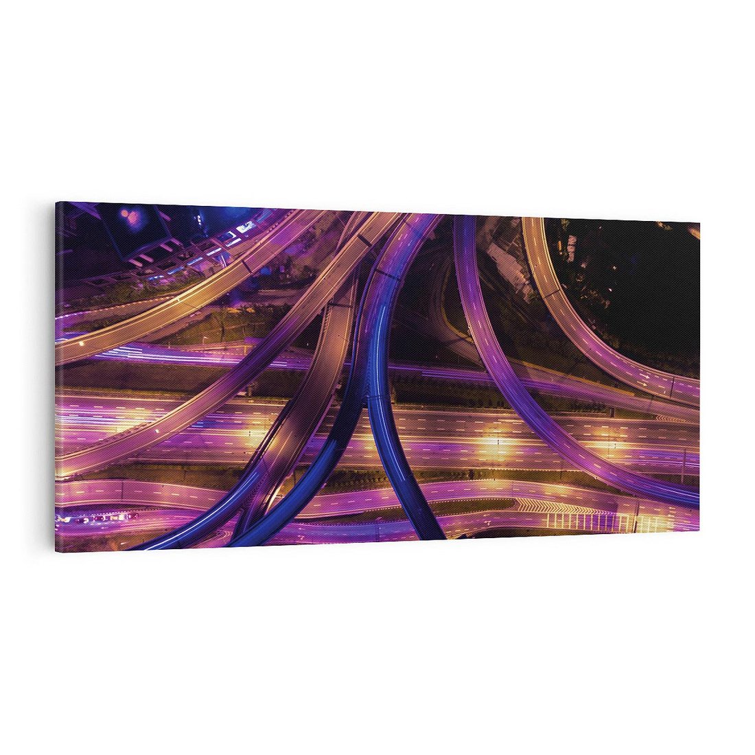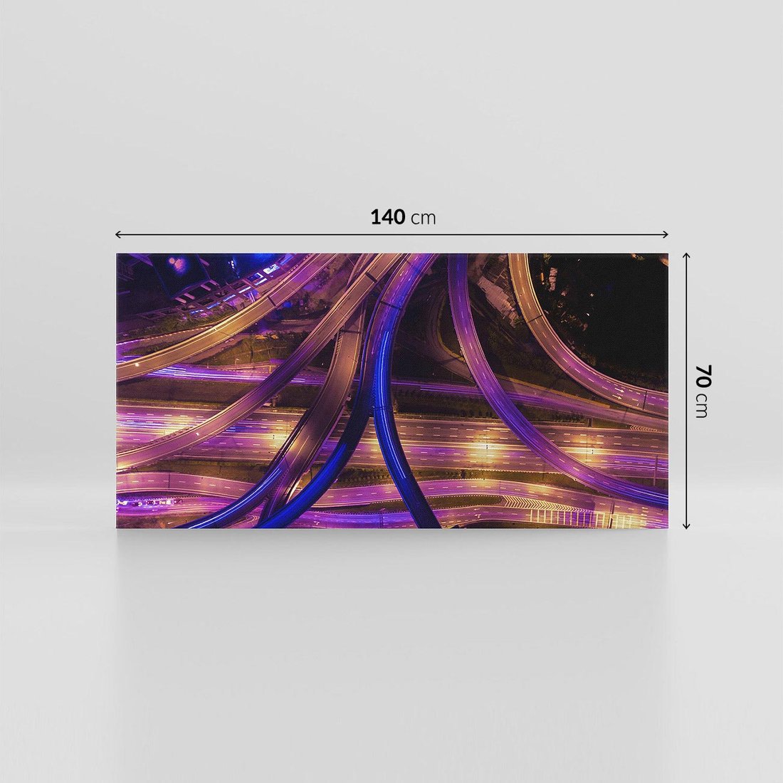 Ten dynamiczny obraz przedstawia skomplikowany węzeł autostradowy z imponującymi wiaduktami. Przenieś się w sam środek miejskiego ruchu i ciesz się widokiem architektonicznego kunsztu, dodając nutę dynamiki i energii do swojego wnętrza tym wyjątkowym dziełem sztuki.