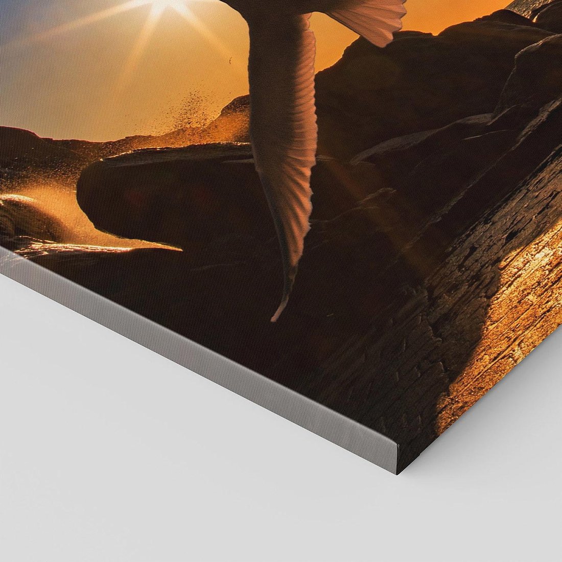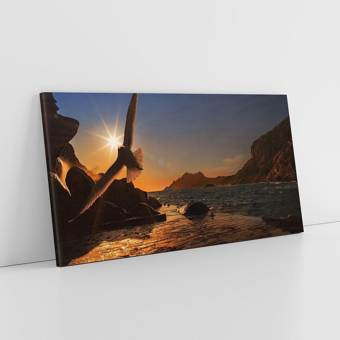 Ten romantyczny obraz ukazuje malowniczy zachód słońca nad morzem, gdzie mewa unosząca się w powietrzu dodaje magii temu wyjątkowemu widokowi. Przenieś się w chwilę spokoju i piękna natury dzięki temu wyjątkowemu dziełu sztuki.