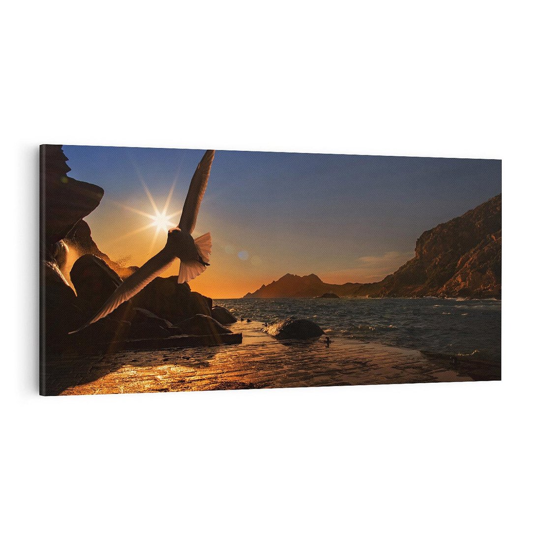 - Obraz na płótnie 140x70 - Zachód słońca nad morzem z mewą