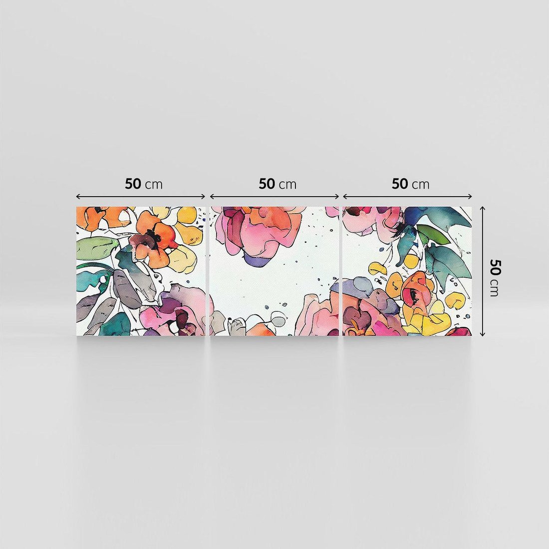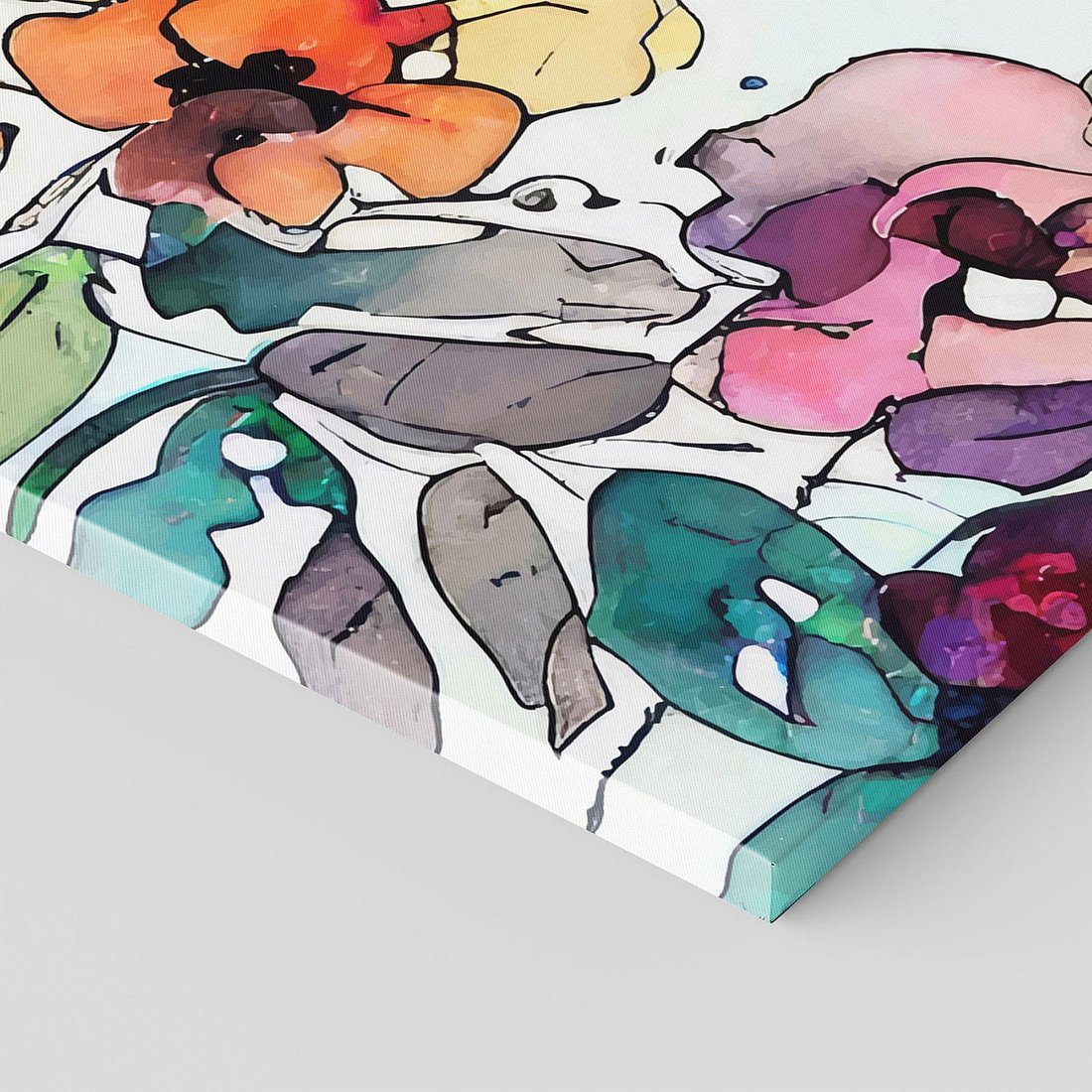 Ten obraz przypomina witrażowe kompozycje, gdzie akwarelowe kwiaty ożywają w intensywnych kolorach. Czarne kontury wydobywają ich piękno i nadają im wyrazistość. To połączenie kunsztu witrażowego z subtelnością kwiatowych motywów tworzy niepowtarzalną wizję natury.