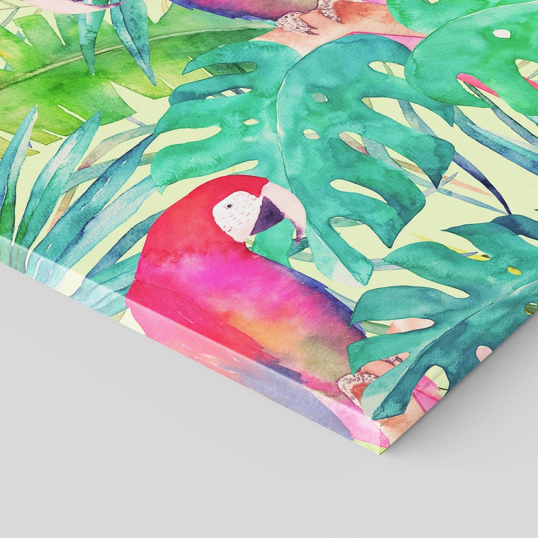 Ta egzotyczna kompozycja przedstawiająca tropikalne liście i papugi wprowadzi do Twojego wnętrza atmosferę egzotycznej przygody i kolorowego świata natury. Odkryj bogactwo kształtów i intensywność barw. Dodaj tropikalnego uroku i wyrazistości do swojego wnętrza.