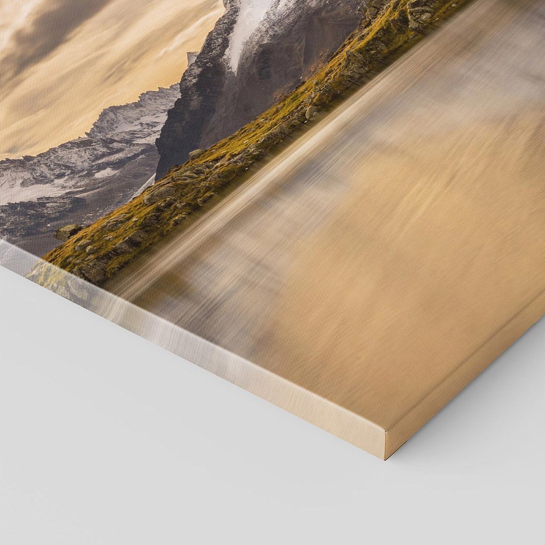 Przenieś się w spokojną atmosferę górskiego jeziora dzięki temu uroczemu obrazowi. Złote promienie słońca, szczyty gór i spokojne wody tworzą harmonijną kompozycję. Ten obraz dodaje spokoju i ukojenia, idealny dla miłośników przyrody i osób pragnących odnaleźć wewnętrzną równowagę.