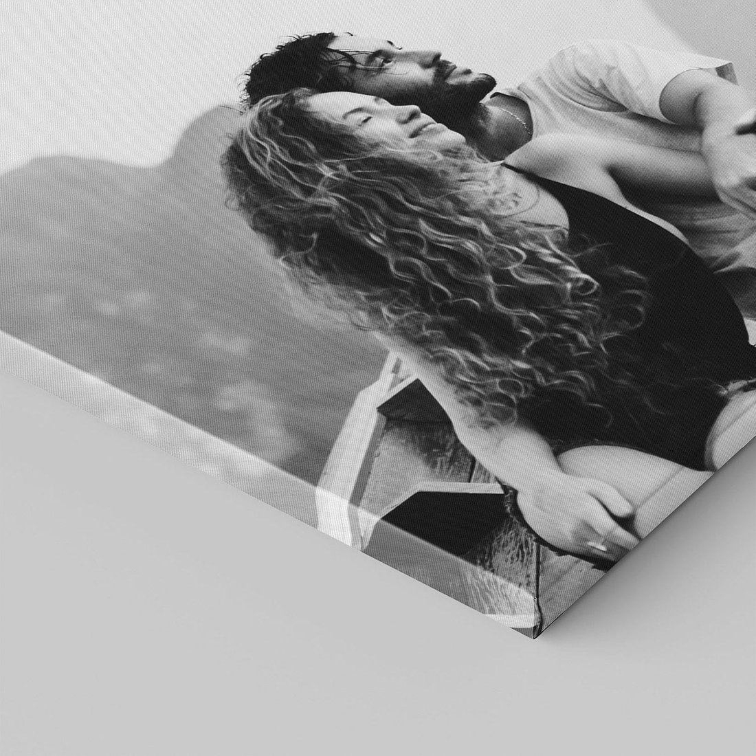 Ta czarno-biała fotografia ukazuje parę zakochanych, siedzących w łodzi i spoglądających w jedną stronę. W tle widoczne są majestatyczne góry, które dodają romantycznego i malowniczego charakteru tej chwili. Złapany moment ukazuje siłę ich miłości, a sceneria gór dodaje magii i siły tej relacji. To uchwycone uczucie w pięknej, naturalnej oprawie.