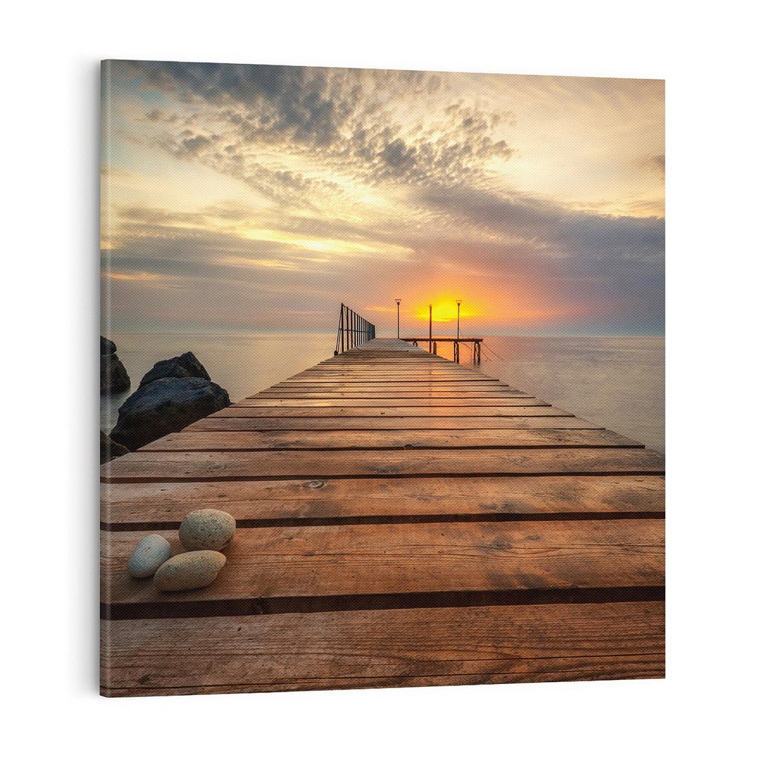 Przenieś się do urokliwej Bułgarii dzięki temu malowniczemu obrazowi przedstawiającemu molo nad morzem. Niebo, błękitne fale i drewniane molo tworzą relaksacyjną atmosferę. Ten obraz dodaje nadmorskiego uroku i spokoju, idealny dla miłośników wakacji nad morzem i morskich krajobrazów.