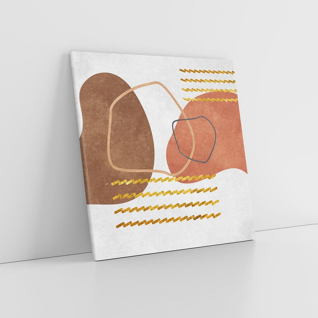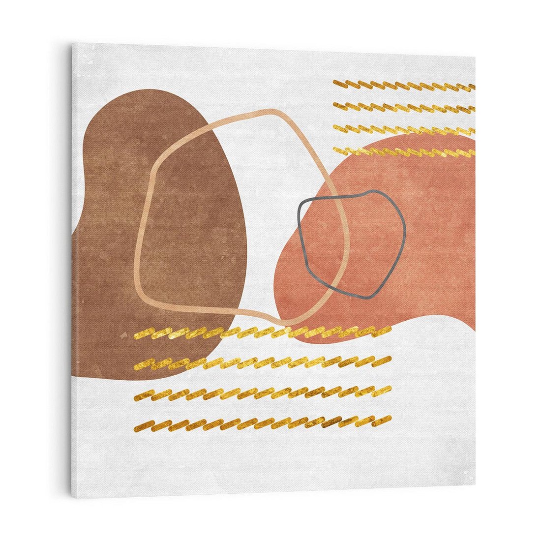 Zapraszamy do odkrycia magicznego obrazu w stylu boho, gdzie abstrakcyjne rozlane plamy ożywiają płótno. Złote zygzaki dodają mu wyjątkowej elegancji. Ciepłe odcienie rudości i brązów emanują harmonią natury. To dzieło sztuki stworzone dla miłośników oryginalnych dekoracji, pragnących wprowadzić artystyczną duszę do swoich wnętrz.
