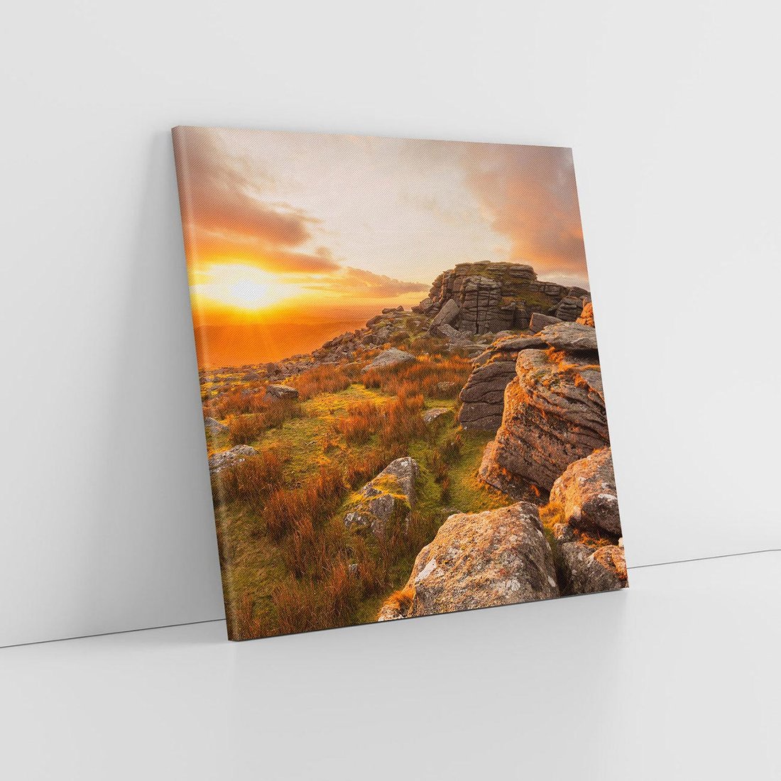 Ten impresjonistyczny obraz na płótnie ukazuje skały oplątane promieniami słońca. Jego ciepłe kolory, kontrast światła i cienia oraz naturalne formacje skalne dodają siły i piękna do Twojego wnętrza. Odczuj moc natury i harmonię krajobrazu w swoim domu.