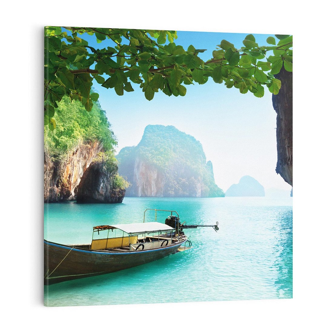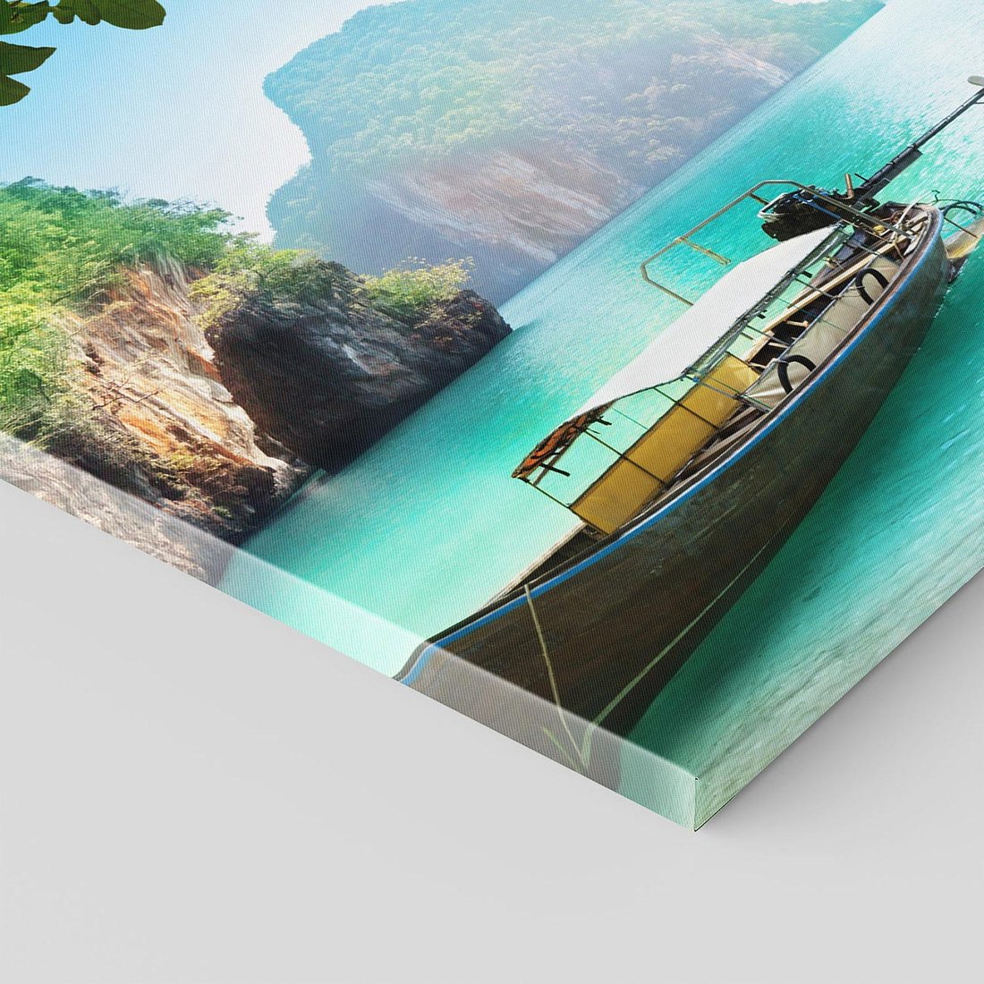 Przenieś się na relaksującą podróż do Tajlandii dzięki temu oczarowującemu obrazowi na płótnie. Łódź dryfująca na spokojnych wodach morza, szmaragdowy krajobraz i piaszczyste plaże tworzą rajski nastrój, który wprowadzi odprężenie i harmonię do Twojego wnętrza.