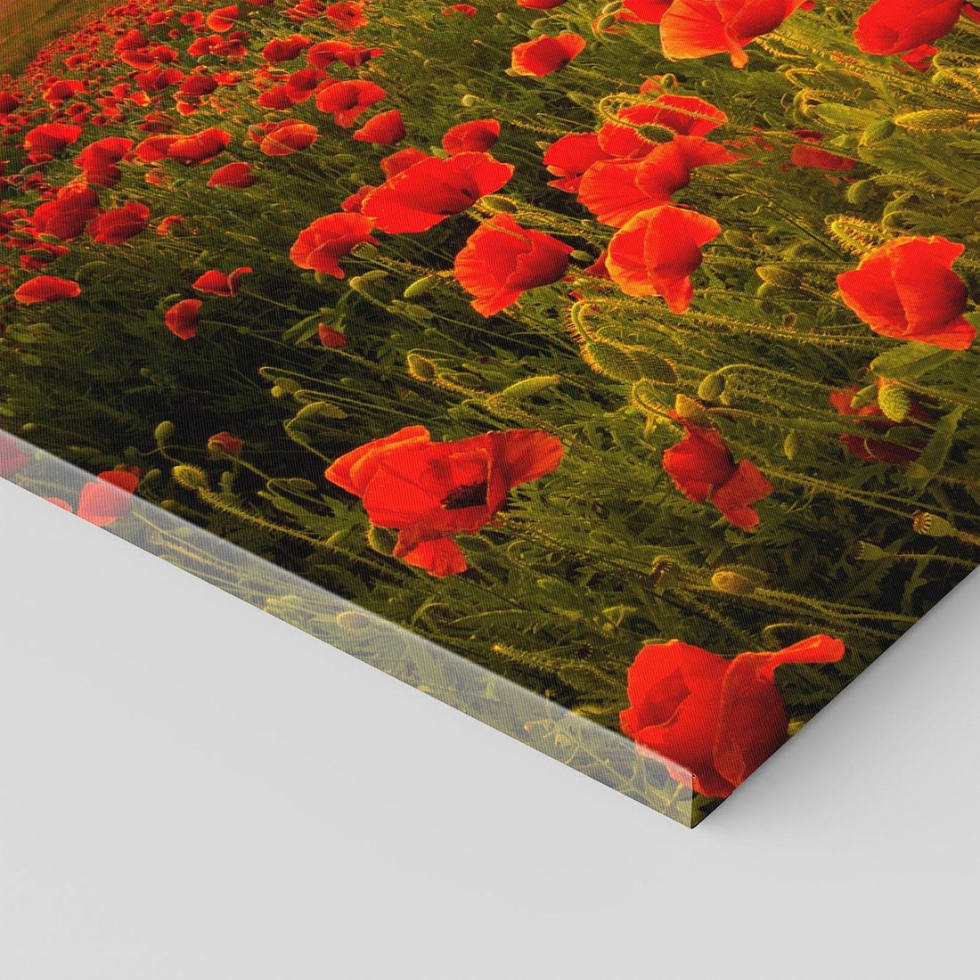 Ożyw swoje wnętrze tym uroczym obrazem przedstawiającym maki przy zachodzie słońca. Ich intensywne czerwone płatki, złote promienie i romantyczny klimat tworzą malowniczą kompozycję. Ten obraz dodaje odczucia piękna natury.