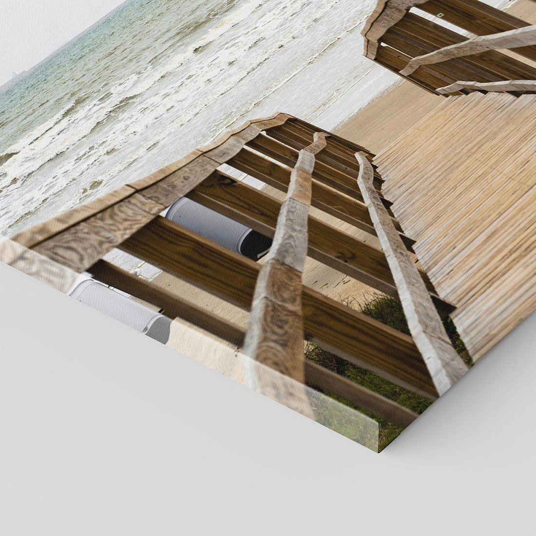 Ta malarska kompozycja przedstawia widok na morze i drewniany pomost, tworząc atmosferę spokoju i wakacyjnego relaksu. Jego kolorystyka i detale wprowadzą do wnętrza nutę morskiego klimatu i sielankowego odpoczynku. Doskonały wybór dla osób pragnących poczuć atmosferę plażowego raju.