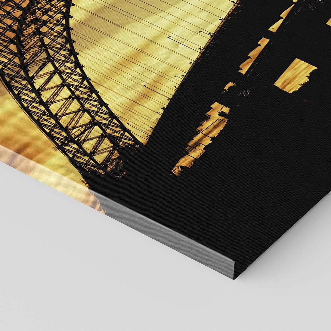 Ten ujmujący obraz przedstawia imponujący most, który oświetlony jest ciepłym blaskiem zachodzącego słońca. Ciesz się widokiem tego malowniczego momentu i dodaj nutę romantyzmu i piękna do swojego wnętrza tym wyjątkowym obrazem.