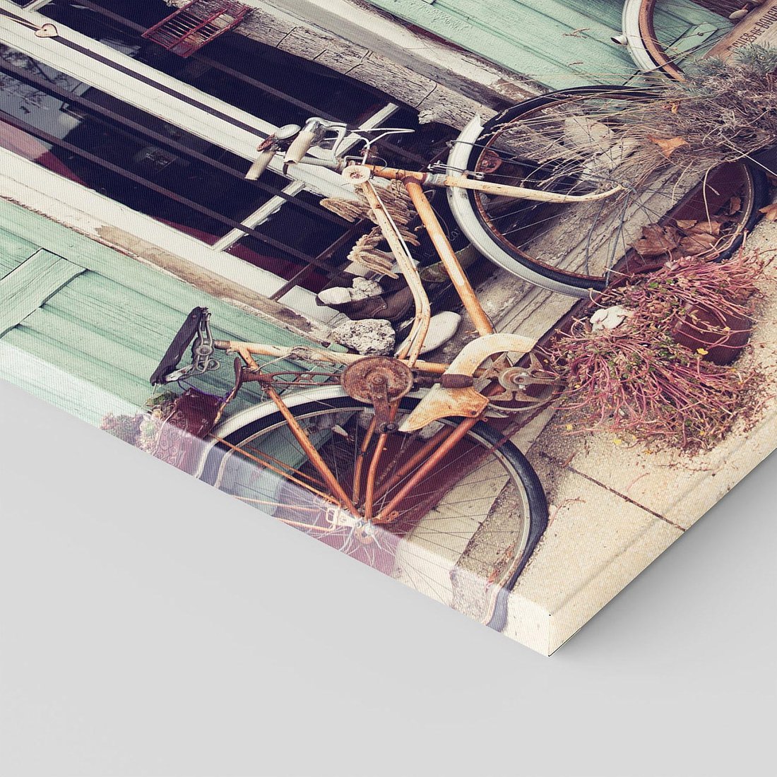 Ten malowniczy obraz na płótnie zaprasza Cię na romantyczny spacer po prowansalskich uliczkach. Rower, sklep z kwiatami i bujne pola tworzą urokliwy krajobraz. Jego pastelowe kolory i wiejski urok dodadzą sielankowego nastroju do Twojego wnętrza.