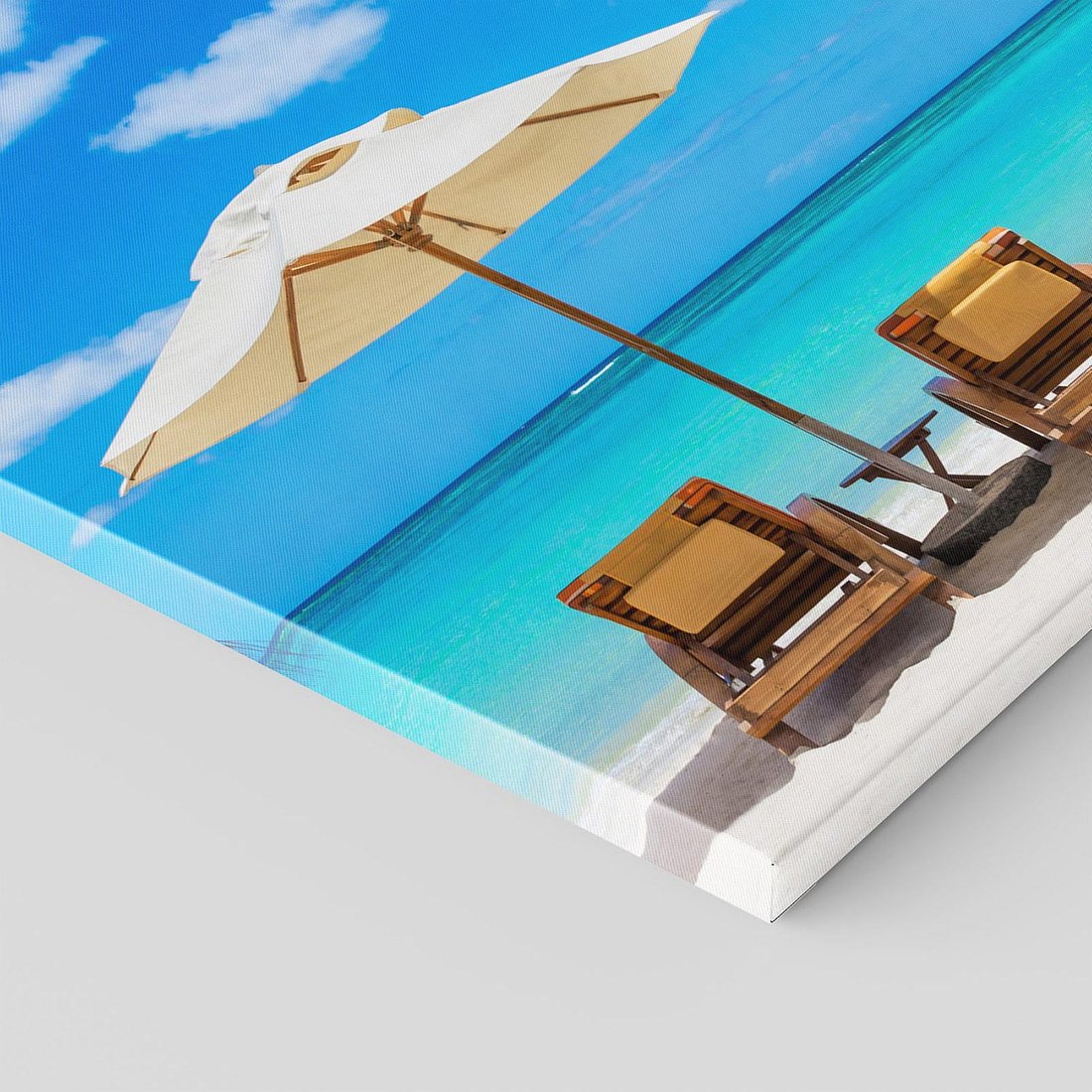 Przenieś się na egzotyczną plażę dzięki temu ujmującemu obrazowi na płótnie. Palma i kolorowe parasole nadają tropikalny klimat, a piasek i turkusowa woda dodają spokoju i świeżości. Dodaj odrobinę raju do swojego wnętrza.