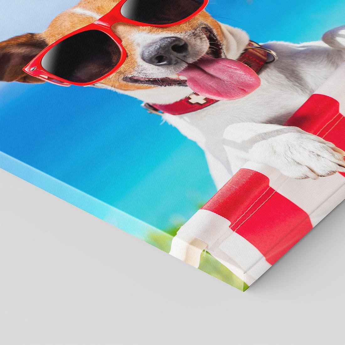 Ożyw swoje wnętrze tym uroczym obrazem przedstawiającym psa w okularach na tle wakacyjnych akcesoriów. Słoneczne promienie, radosna energia i wakacyjny nastrój tworzą beztroską atmosferę. Ta kompozycja dodaje uśmiechu i radości, idealna dla miłośników zwierząt i wakacyjnych wspomnień.