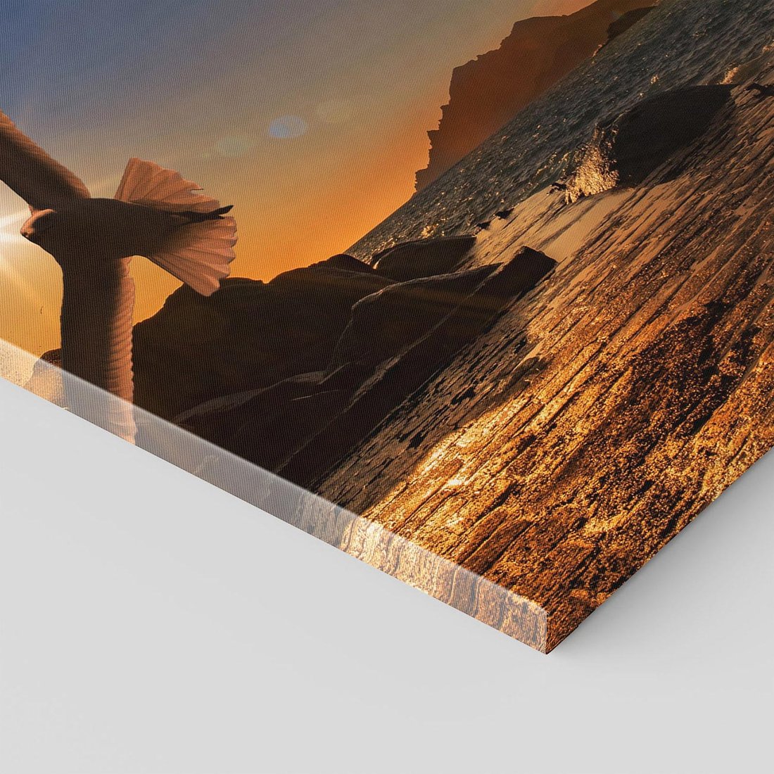 Ten romantyczny obraz ukazuje malowniczy zachód słońca nad morzem, gdzie mewa unosząca się w powietrzu dodaje magii temu wyjątkowemu widokowi. Przenieś się w chwilę spokoju i piękna natury dzięki temu wyjątkowemu dziełu sztuki.