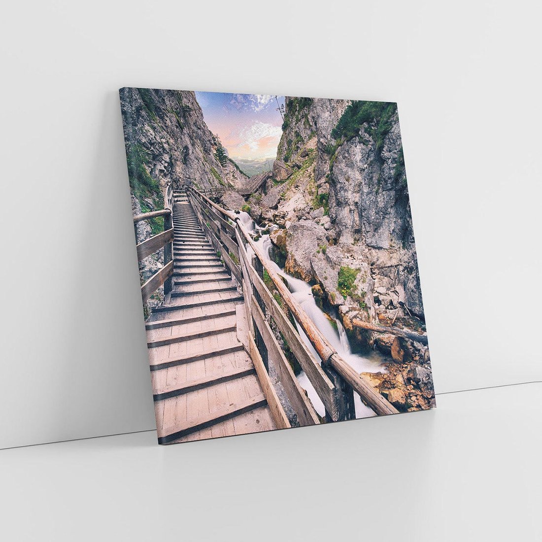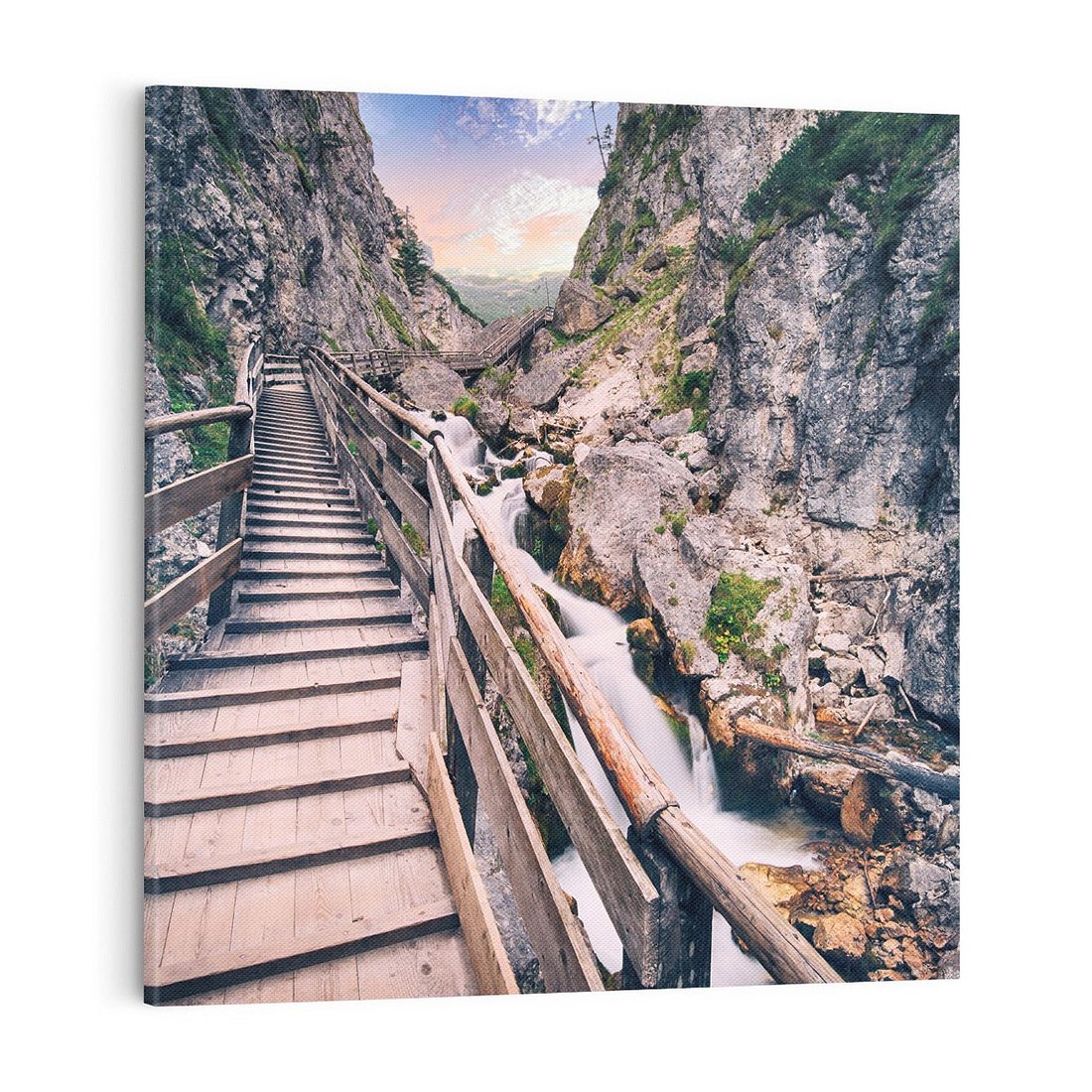 Ten malowniczy obraz przeniesie Cię na szlak górski, gdzie schody prowadzą wśród skalistego krajobrazu. Ciesz się widokiem naturalnego piękna i dodaj odrobinę przygody i natury do swojego wnętrza tym wyjątkowym dziełem sztuki.
