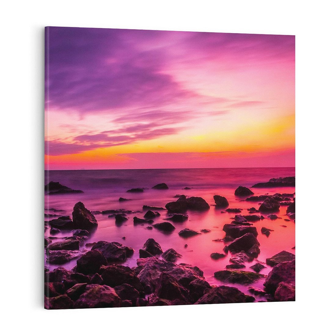 Ten urokliwy obraz przeniesie Cię na brzeg morza, gdzie piękne skały tworzą harmonię z plażą. Ciesz się widokiem ich kontrastu i dodaj odrobinę natury i spokoju do swojego wnętrza tym wyjątkowym obrazem.