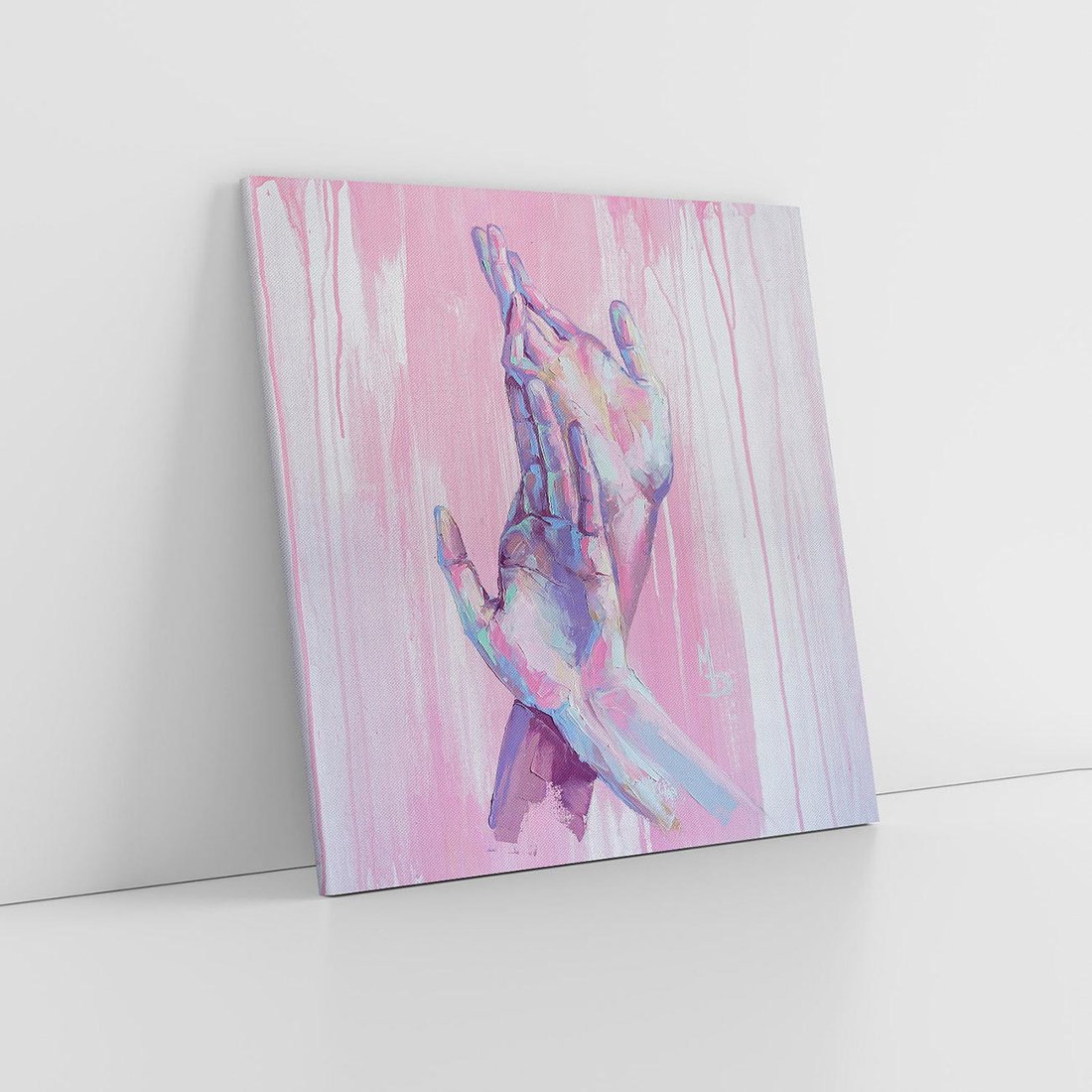 Ten nowoczesny obraz olejny w pastelowych kolorach prezentuje splecione dłonie jako główny motyw. Delikatne odcienie pasteli nadają mu subtelności i spokoju, tworząc jednocześnie abstrakcyjną i znaczącą kompozycję. To dzieło sztuki emanuje harmonią i jednością, symbolizującą współpracę, miłość lub zrozumienie między ludźmi. Idealnie pasuje do wnętrz o nowoczesnym designie, które cenią sobie sztukę jako wyraz emocji i relacji.