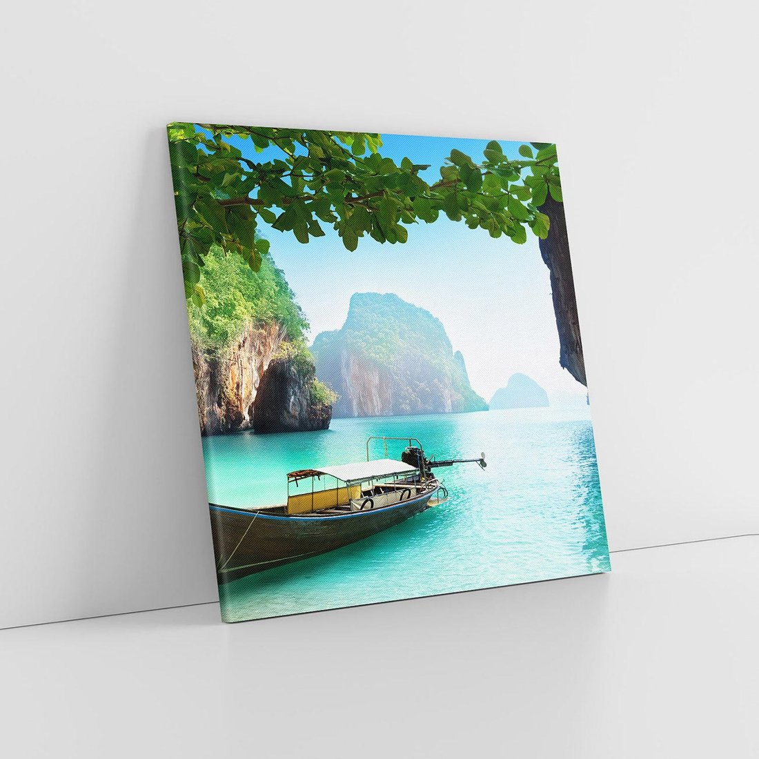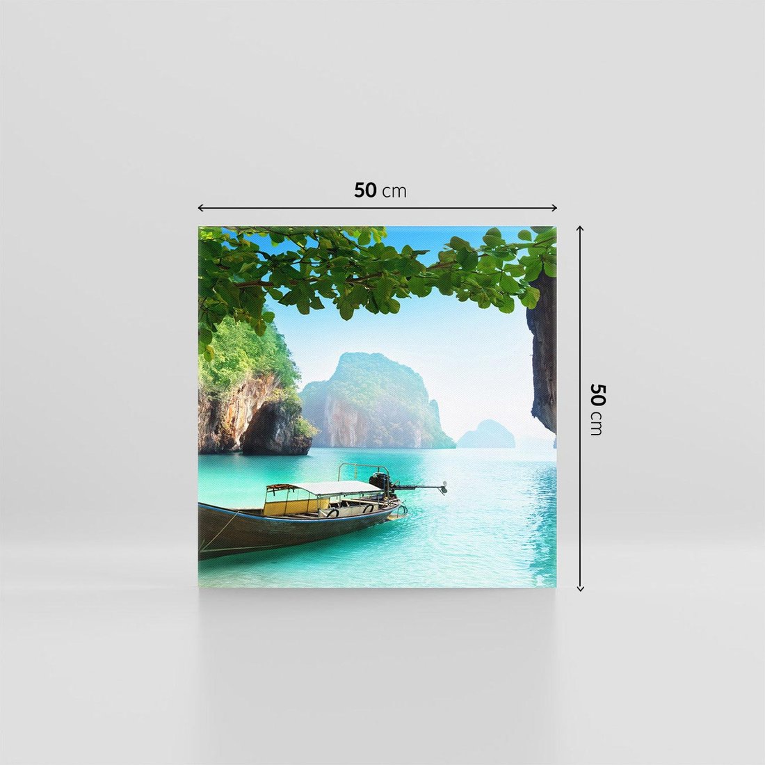 Przenieś się na relaksującą podróż do Tajlandii dzięki temu oczarowującemu obrazowi na płótnie. Łódź dryfująca na spokojnych wodach morza, szmaragdowy krajobraz i piaszczyste plaże tworzą rajski nastrój, który wprowadzi odprężenie i harmonię do Twojego wnętrza.