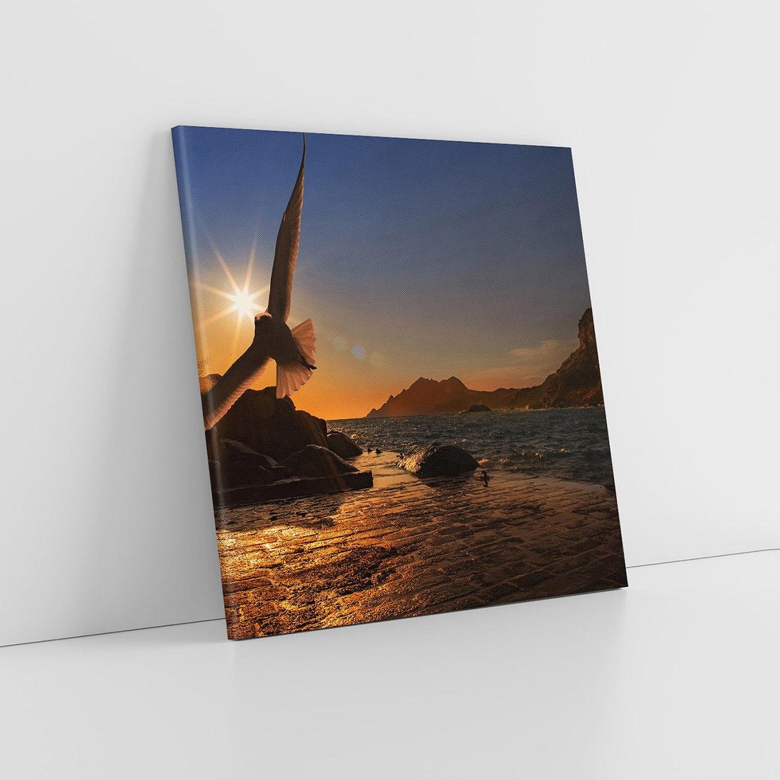 Ten romantyczny obraz ukazuje malowniczy zachód słońca nad morzem, gdzie mewa unosząca się w powietrzu dodaje magii temu wyjątkowemu widokowi. Przenieś się w chwilę spokoju i piękna natury dzięki temu wyjątkowemu dziełu sztuki.