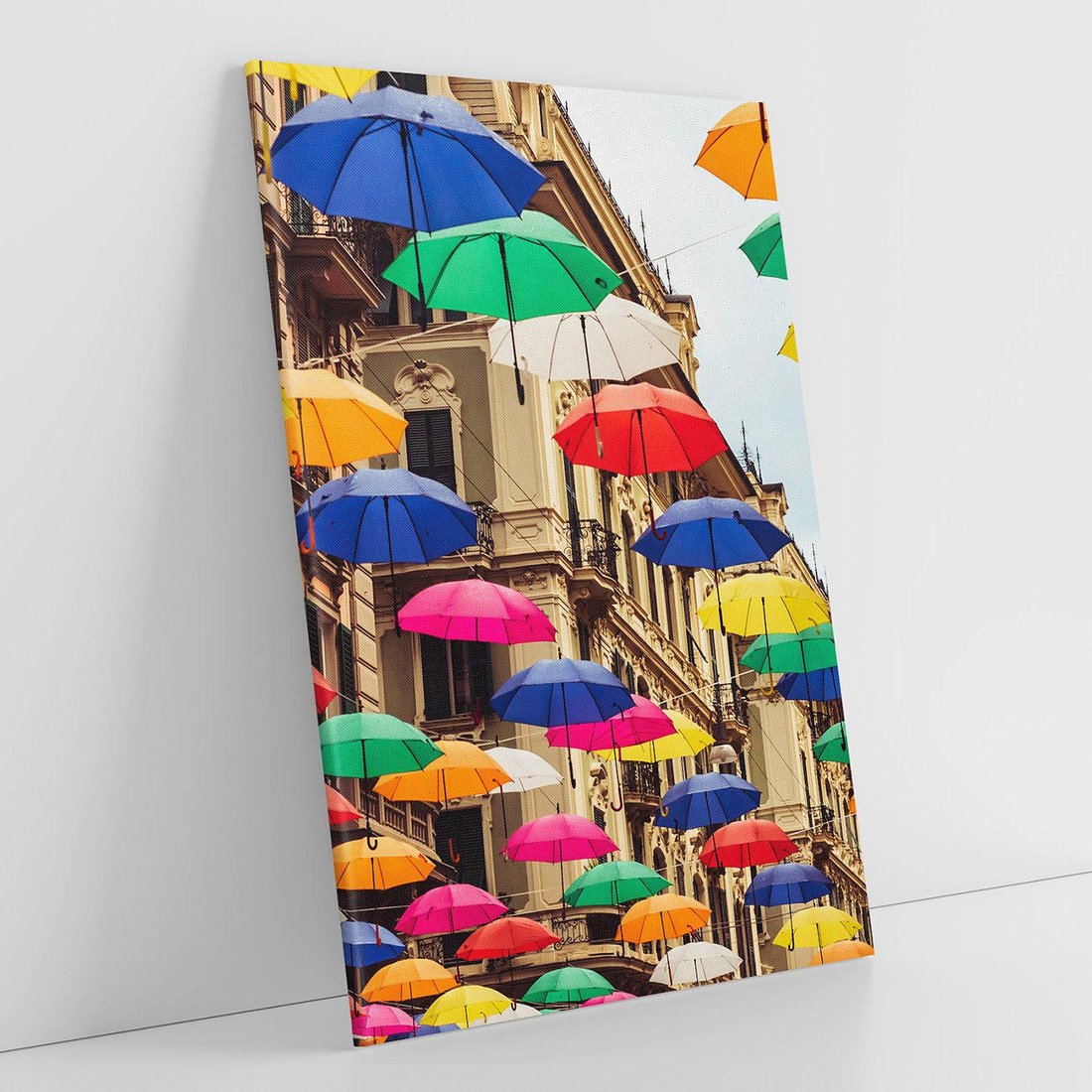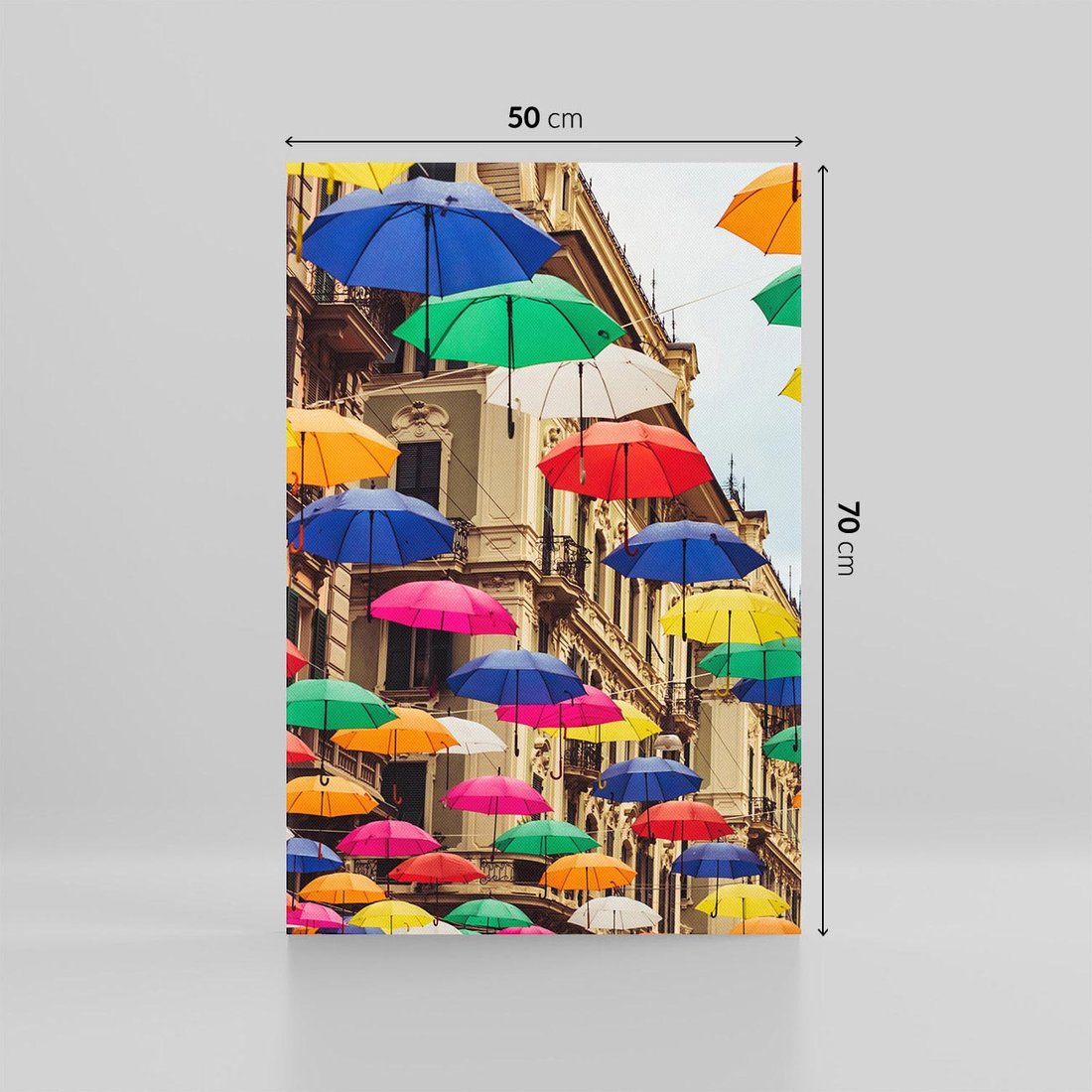 Obraz na płótnie 50x70 - Barwna symfonia wyobraźni - fotografia, kolorowe parasolki podwieszone nad ulicą