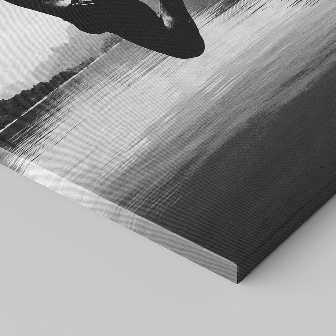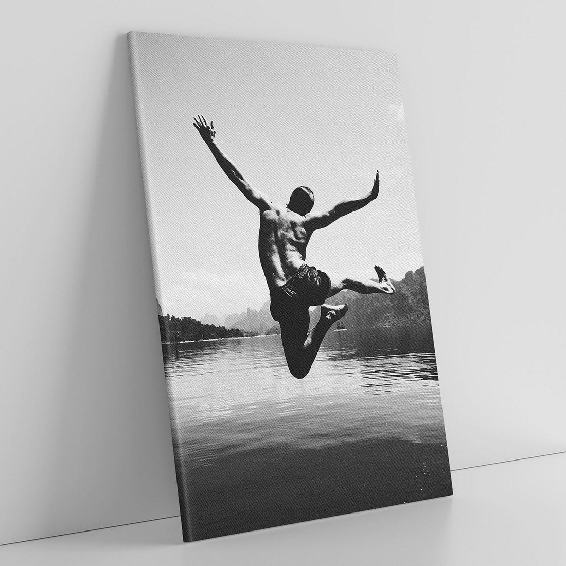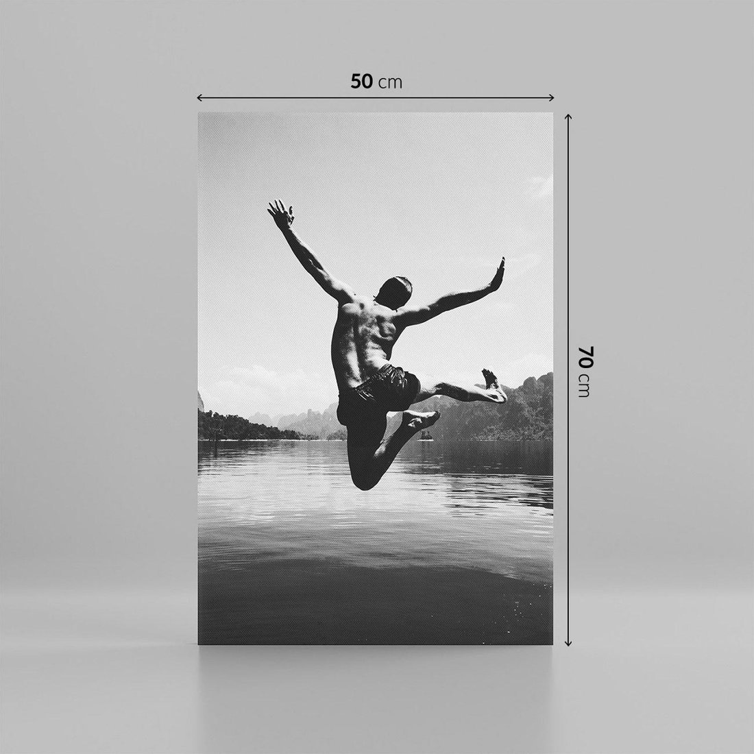 Obraz na płótnie 50x70 - Beztroska Chwila - czarno biała fotografia, mężczyzna wesoło wskakuje do keziora w górach