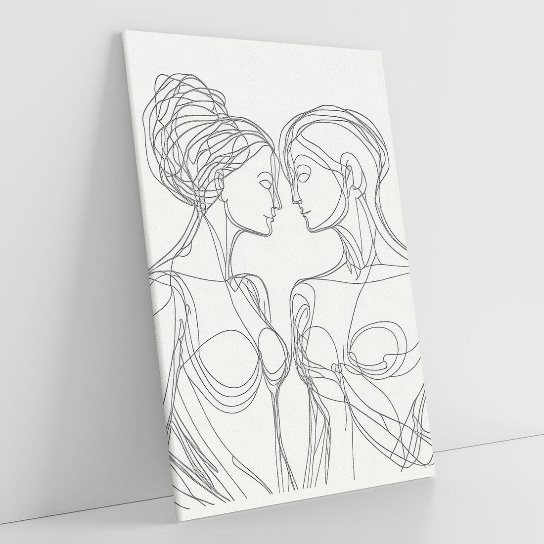 Ten czarno-biały szkic w stylu "one line art" przedstawia parę kobiet, które stoją naprzeciwko siebie. Cała kompozycja została utworzona za pomocą jednej ciągłej kreski, co nadaje jej charakterystyczny wyraz artystyczny. Minimalizm i elegancja podkreślają piękno prostoty, pozwalając na refleksję nad relacjami między postaciami.