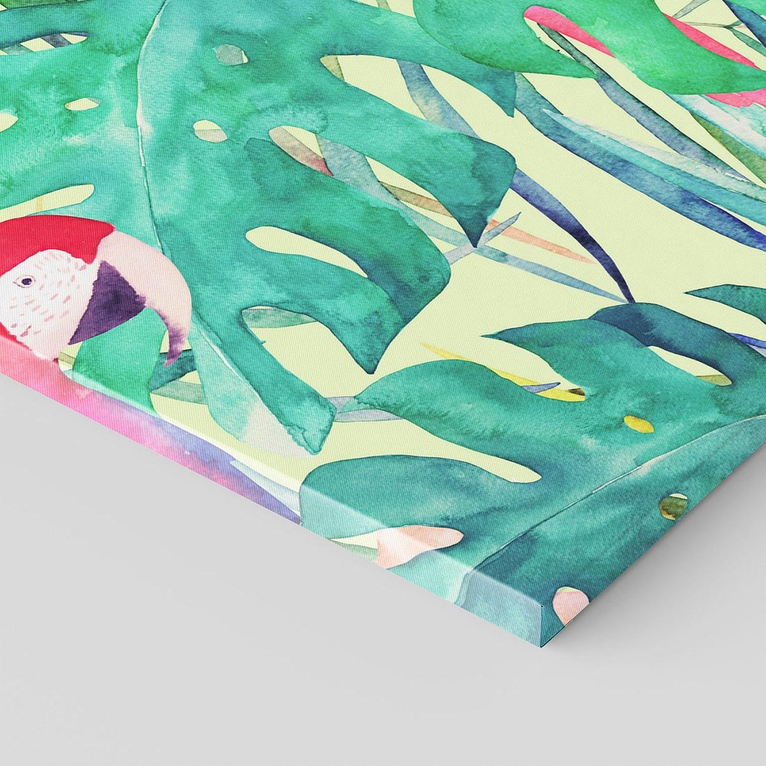 Ta egzotyczna kompozycja przedstawiająca tropikalne liście i papugi wprowadzi do Twojego wnętrza atmosferę egzotycznej przygody i kolorowego świata natury. Odkryj bogactwo kształtów i intensywność barw. Dodaj tropikalnego uroku i wyrazistości do swojego wnętrza.
