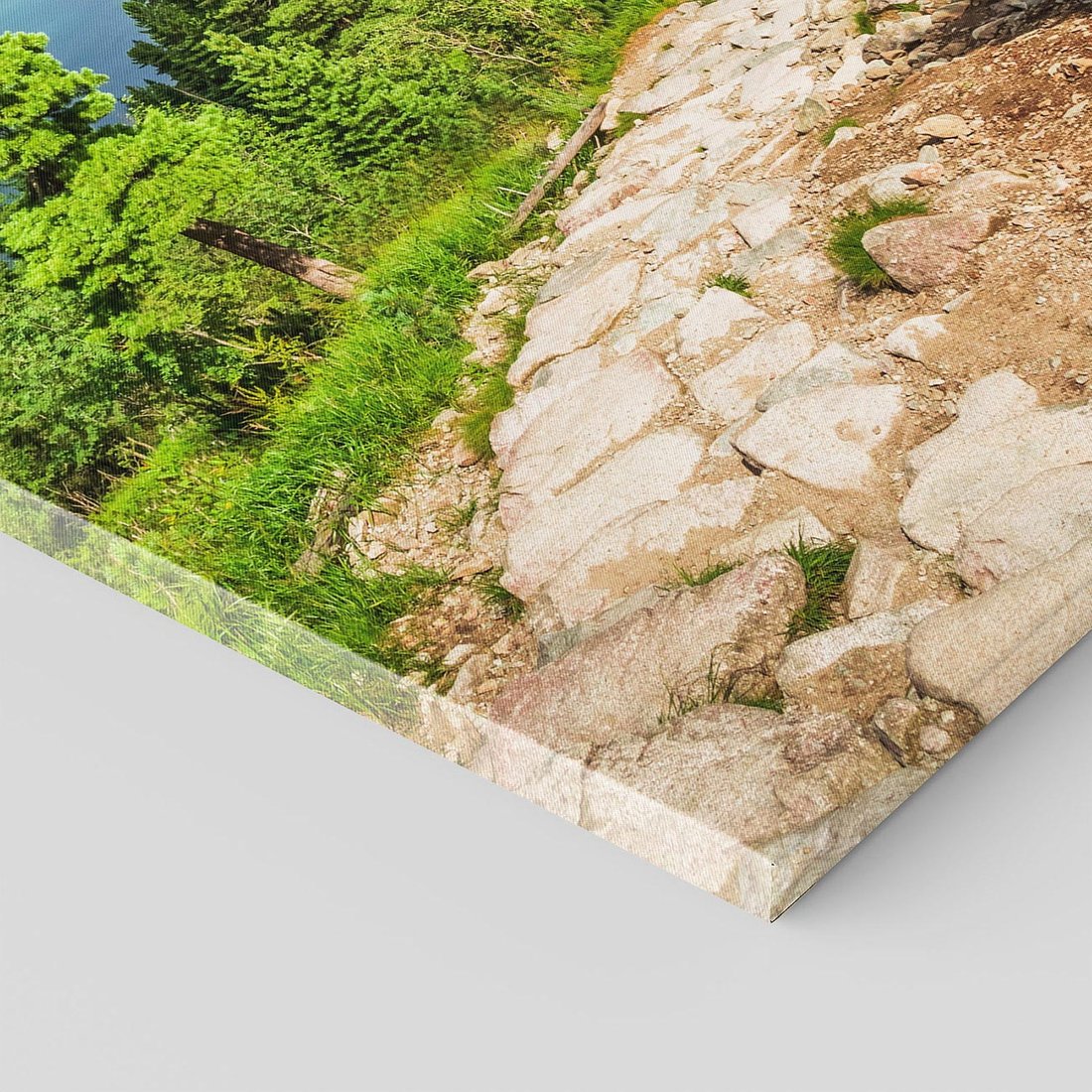 Ciesz się pięknem górskiego krajobrazu dzięki temu malowniczemu obrazowi przedstawiającemu jezioro wśród majestatycznych gór. Spokojna woda, malownicze krajobrazy i nastrojowa atmosfera tworzą harmonijną aurę. Ten obraz dodaje spokoju i bliskości natury, idealny dla osób pragnących przenieść się w świat górskiej harmonii.