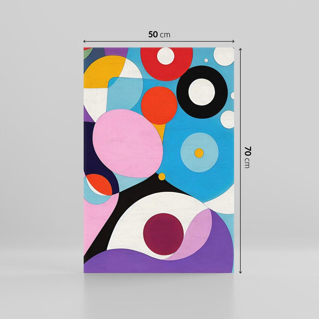 Ten abstrakcyjny obraz olejny wyróżnia się żywymi kolorami oraz kompozycją kółek i kropek. Kolorowe kształty tworzą radosne i dynamiczne wrażenie, a ich układ może być dowolny, tworząc fascynującą abstrakcję. Obraz ten może wywoływać różne emocje i interpretacje, co czyni go doskonałym dodatkiem do nowoczesnych wnętrz, które cenią sobie sztukę abstrakcyjną i wyraziste kolory. To dzieło sztuki dodaje energii i witalności każdemu pomieszczeniu.