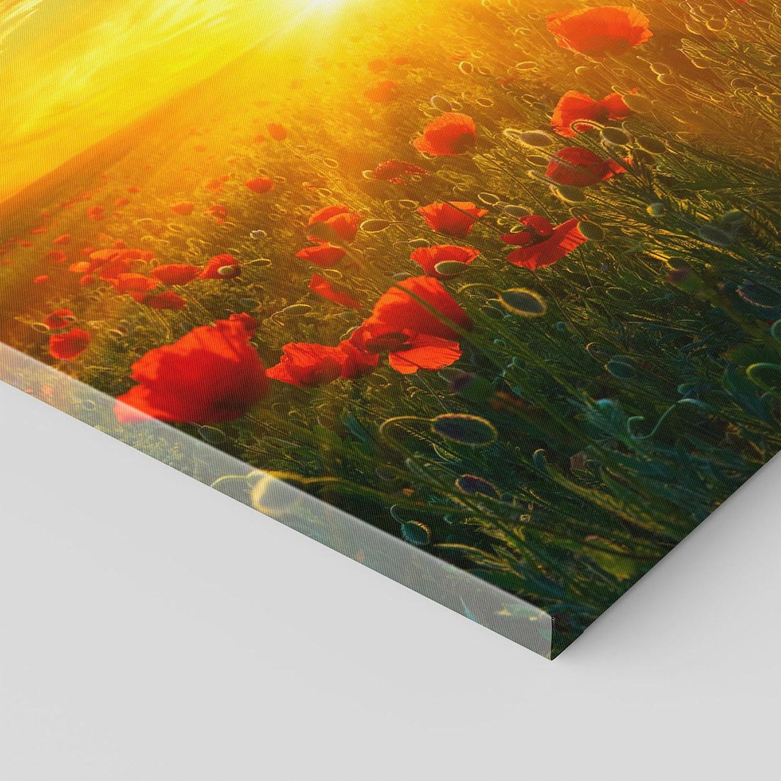 Ożyw swoje wnętrze tym ujmującym obrazem przedstawiającym magiczny zachód słońca na kolorowej łące pełnej maków. Soczyste kolory, delikatne płatki i złote promienie tworzą malowniczą kompozycję. Ten obraz dodaje romantyzmu i odczucia piękna natury, idealny dla miłośników zachodów słońca i kwiatów.