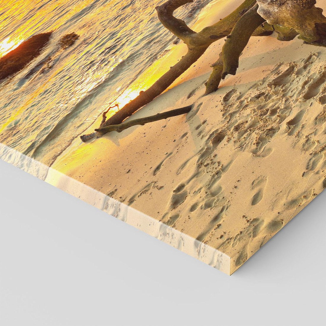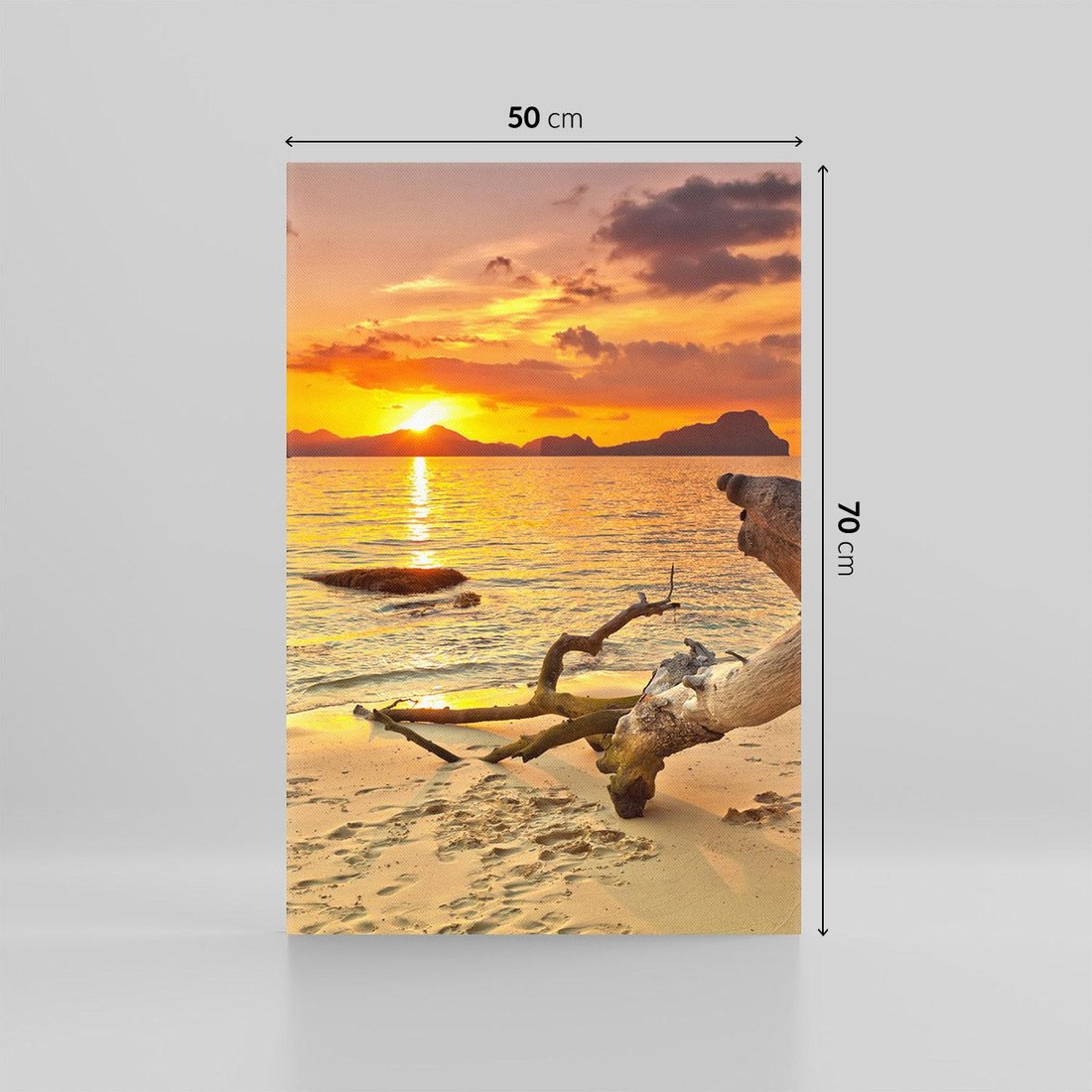 Zanurz się w złocistych promieniach zachodzącego słońca na tym spektakularnym obrazie na płótnie. Plaża, morze i kolorowe niebo tworzą romantyczną i magiczną atmosferę. Ta kompozycja przynosi uczucie spokoju i kontemplacji, idealna do tworzenia relaksującego nastroju w domu.
