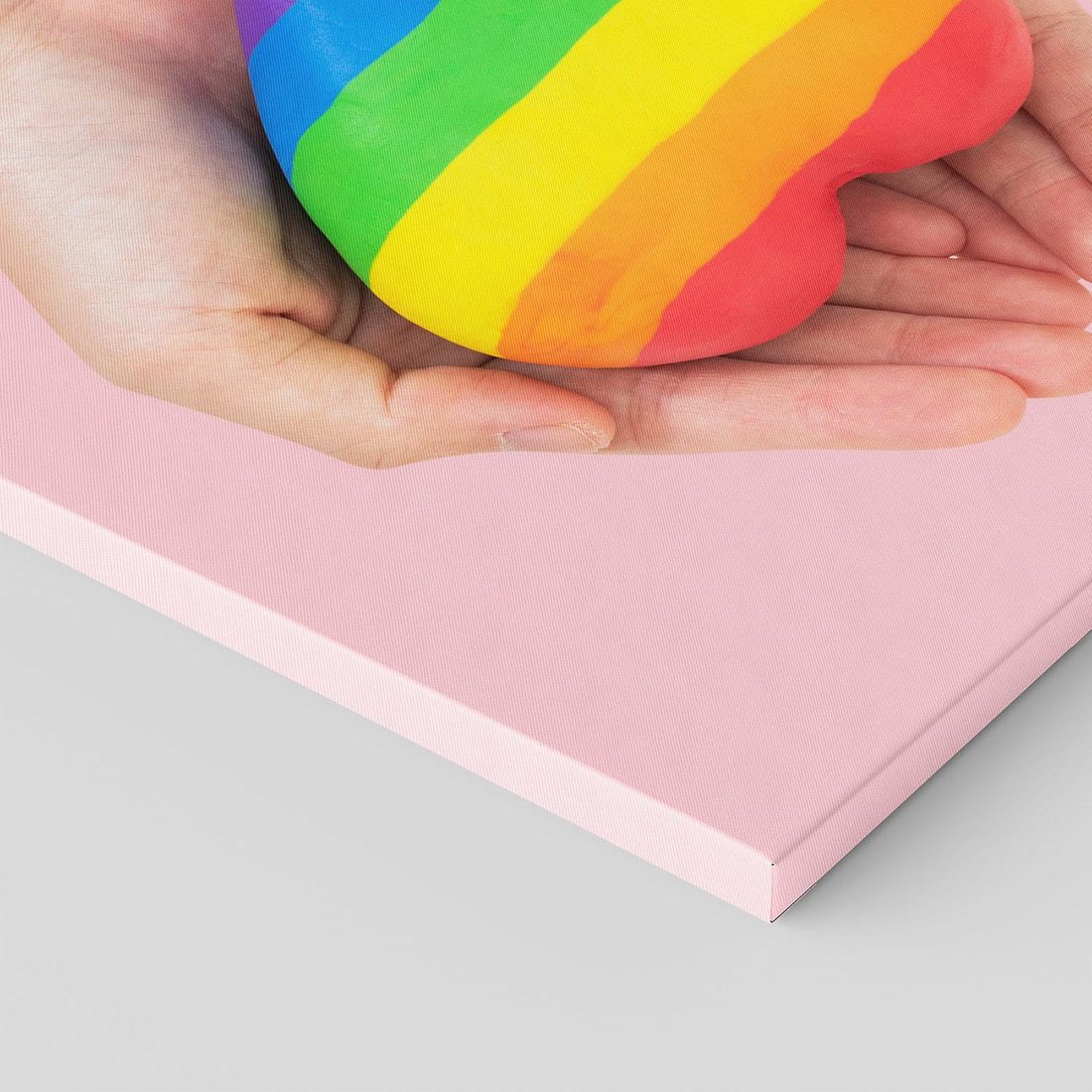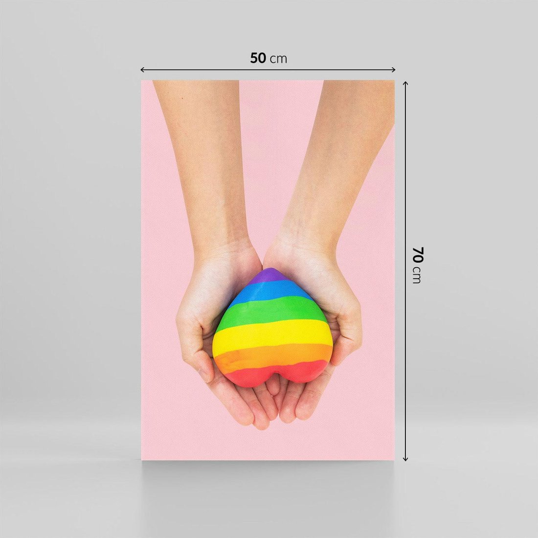 Obraz na płótnie 50x70 - Miłość na Dłoniach - zdjęcie, dłonie trzymają ulepione tęczowe serce